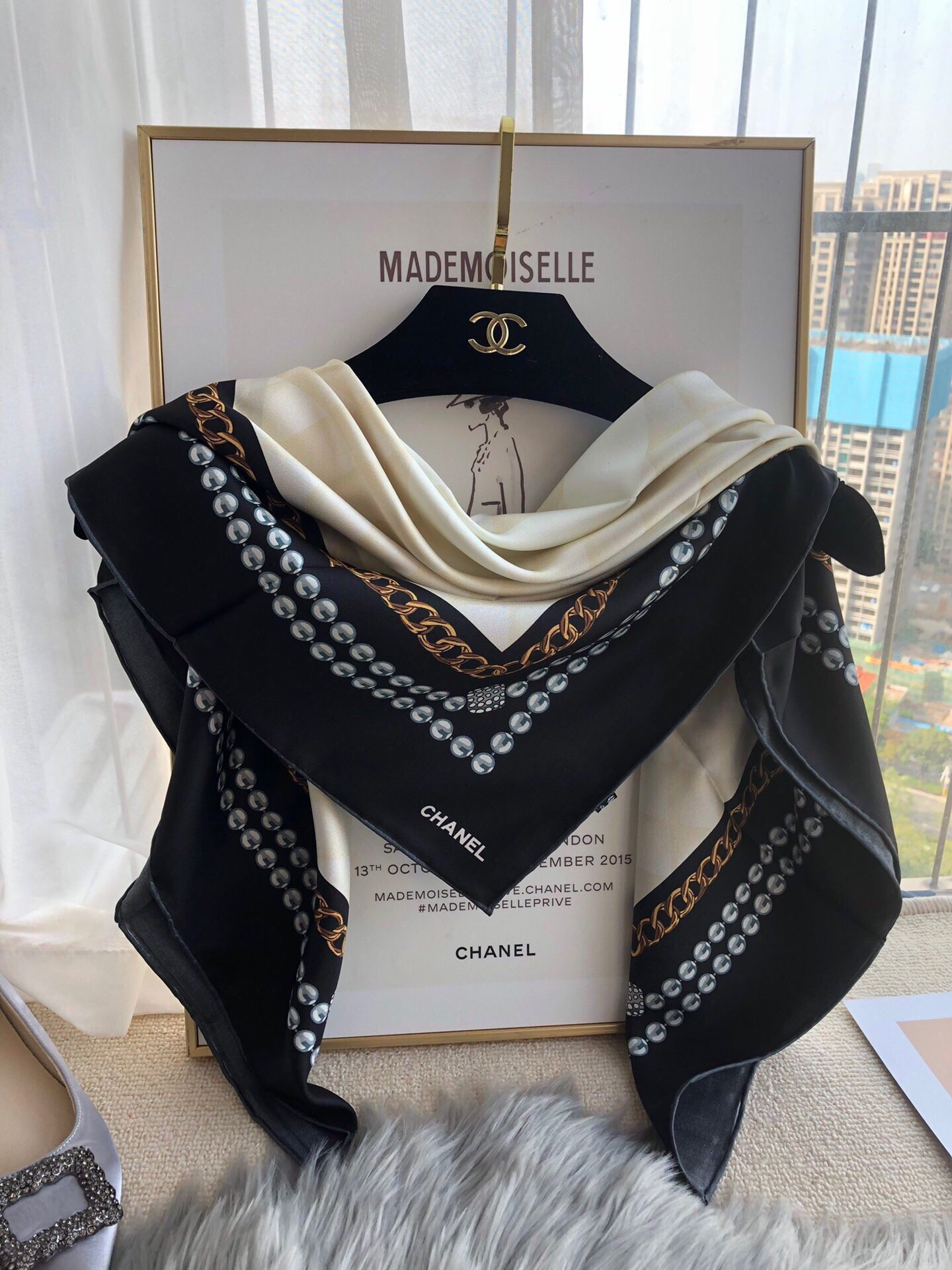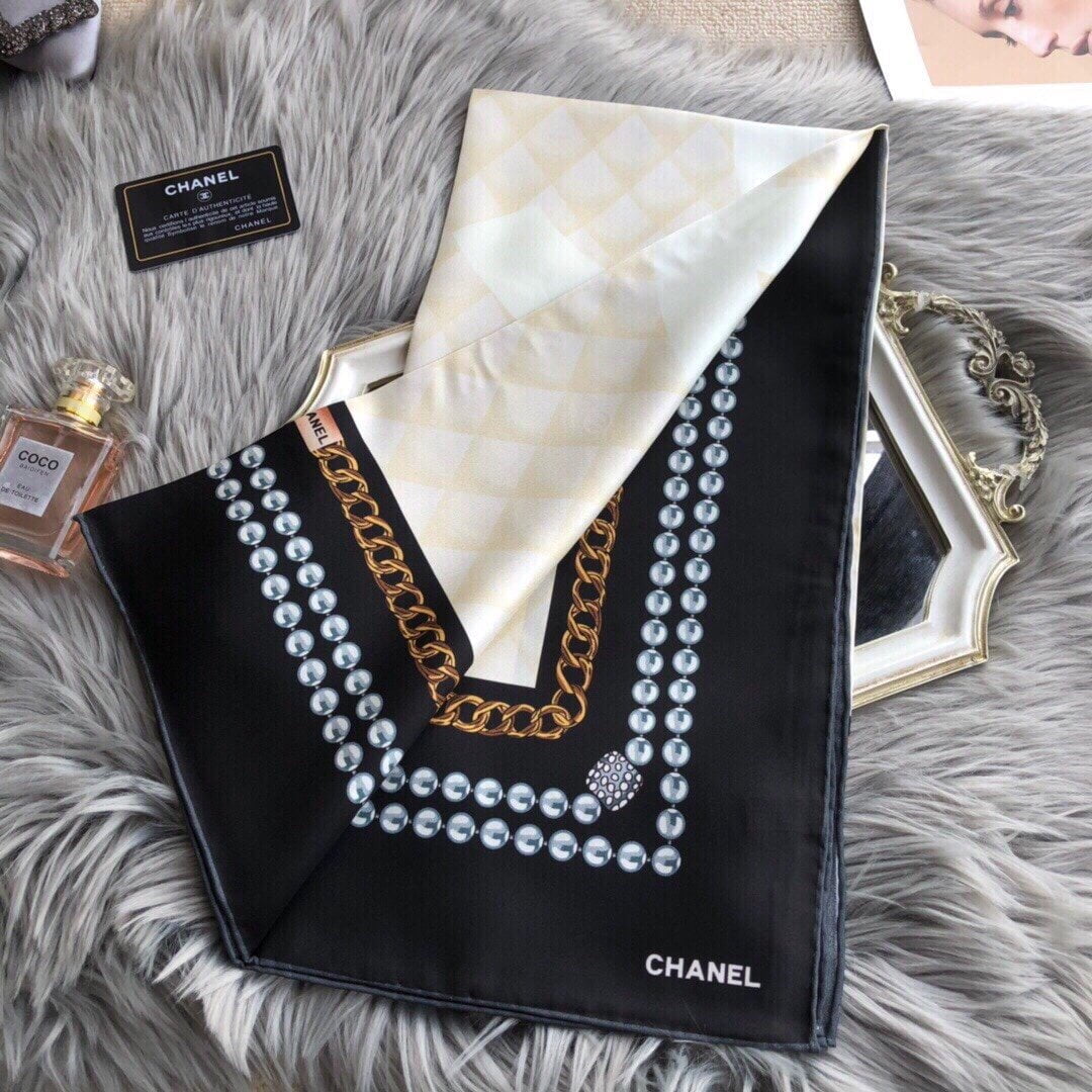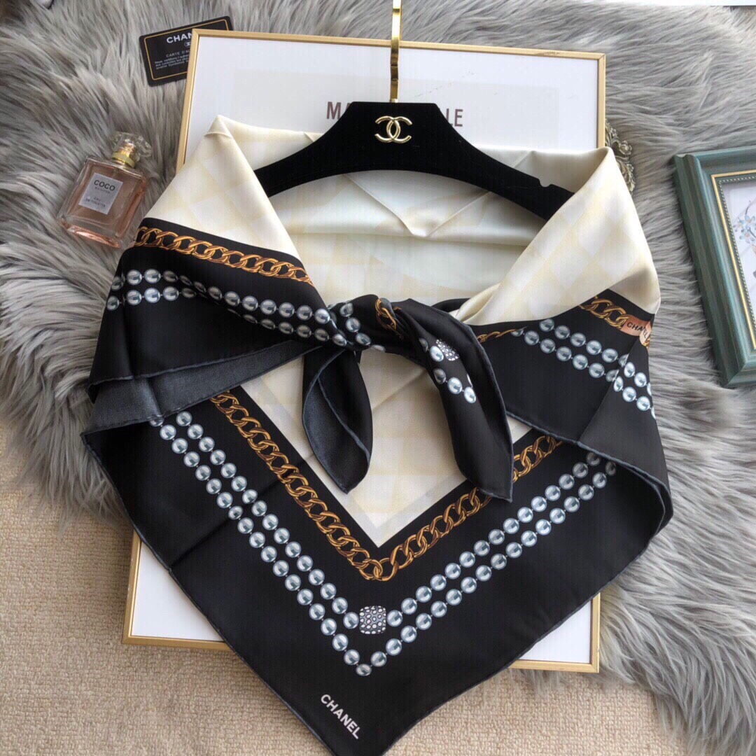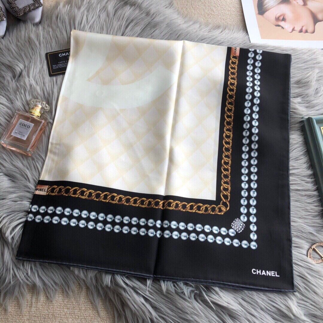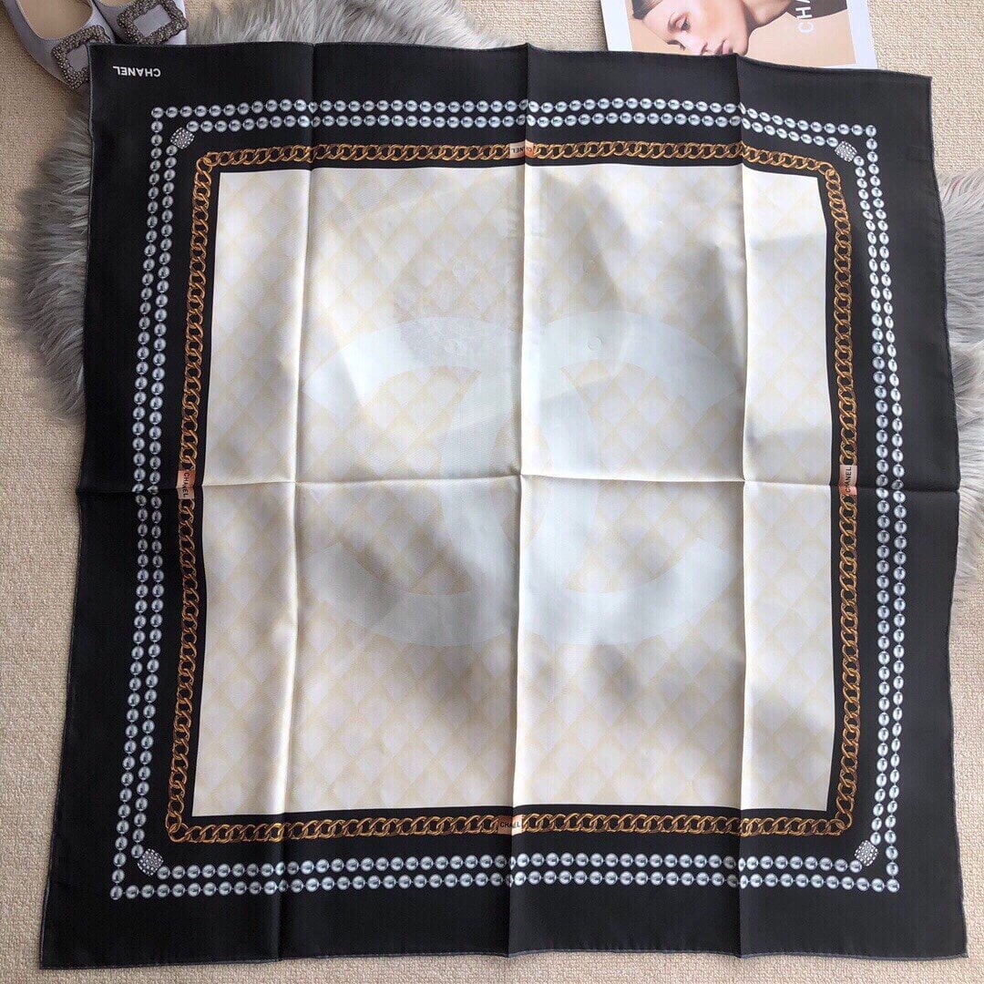Chanel CC Pattern in Beige Black Border Square Scarf 110cm/43in