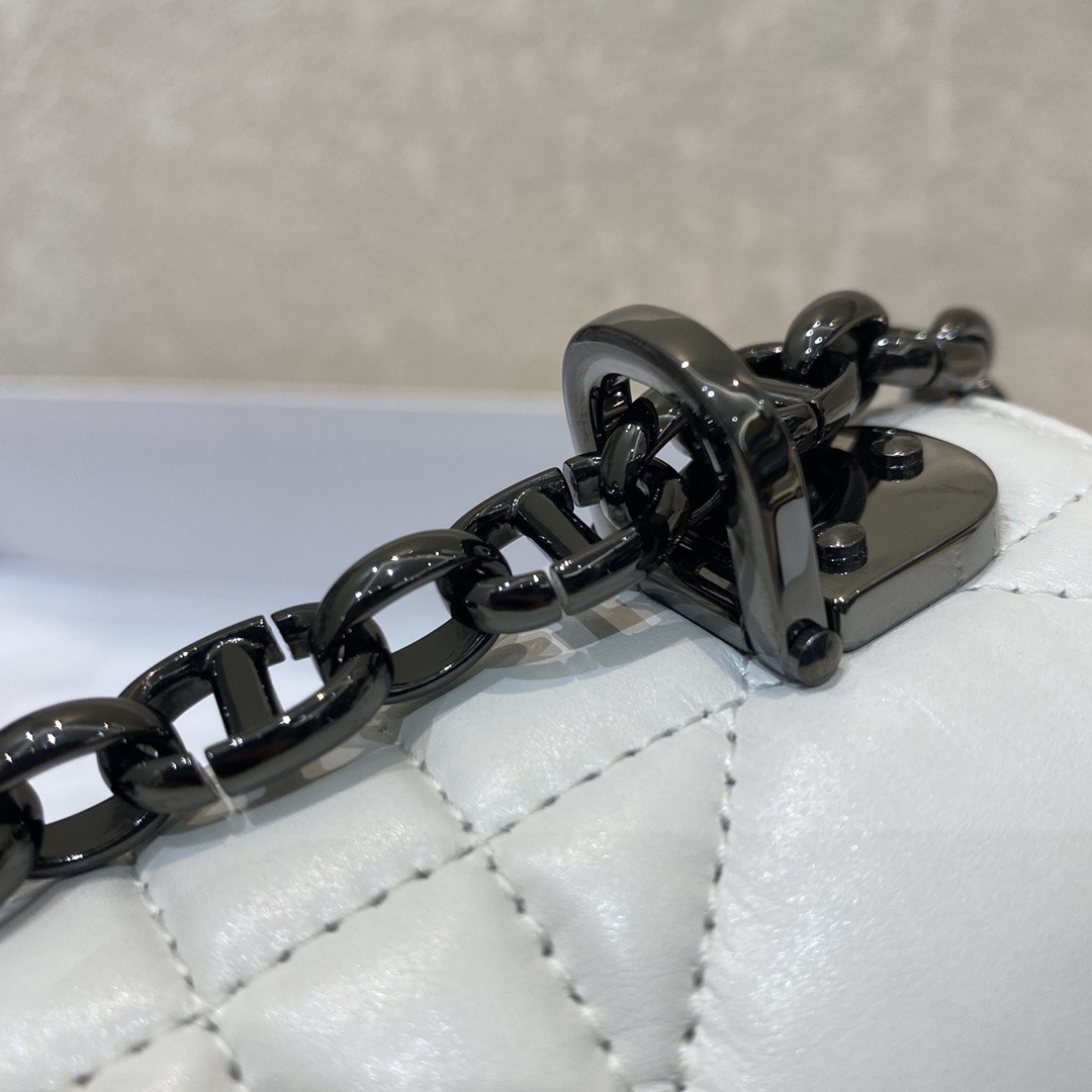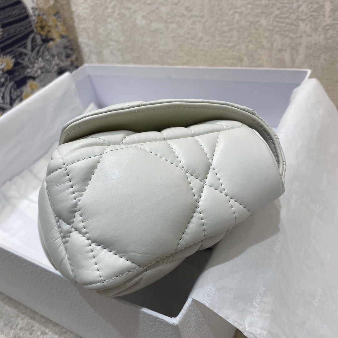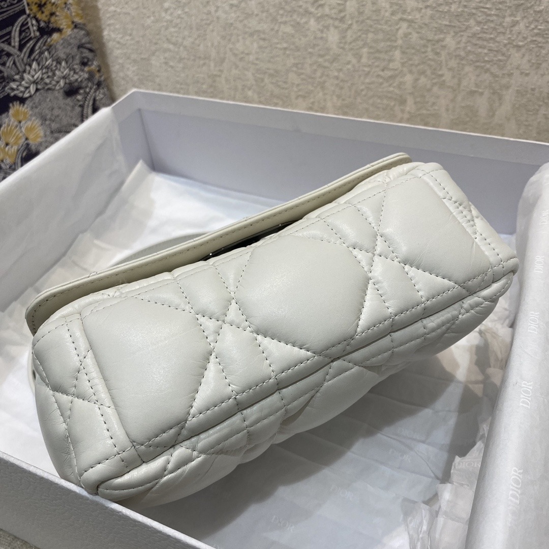 The Dior Caro bag combines modernity with timeless elegance. The design is crafted in white supple with Cannage stitching. The bag features a flap adorned with an antique metal ‘CD’ twist clasp, inspired by the seal of a Christian Dior perfume bottle. The detachable chain shoulder strap with ‘CD’ signature links allows it to be carried by hand, over the shoulder or crossbody, or replaced by one of the House’s wide embroidered straps, allowing the large bag to pair with day or evening attire.