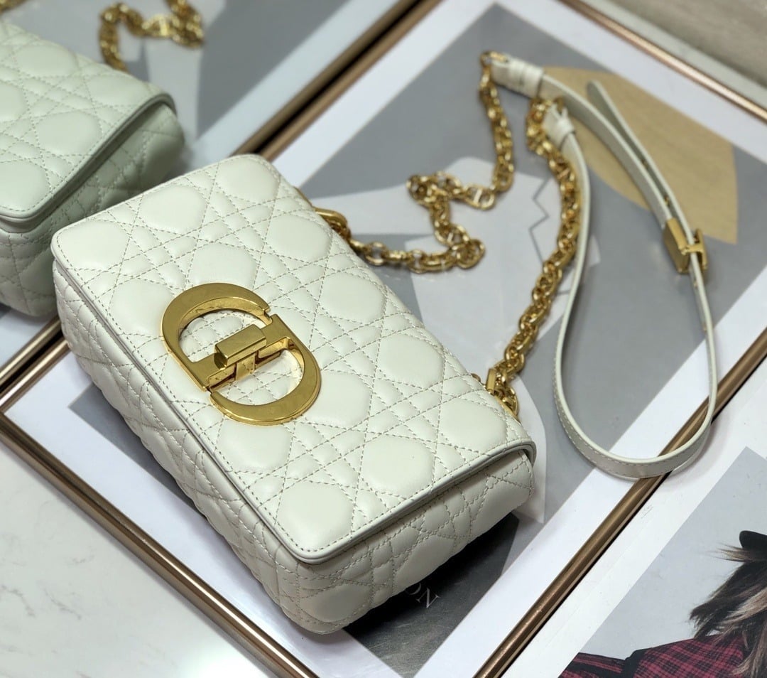 The Dior Caro bag combines modernity with timeless elegance. The design is crafted in white supple with Cannage stitching. The bag features a flap adorned with an antique gold-finish metal ‘CD’ twist clasp, inspired by the seal of a Christian Dior perfume bottle. The detachable chain shoulder strap with ‘CD’ signature links allows it to be carried by hand, over the shoulder or crossbody, or replaced by one of the House’s wide embroidered straps, allowing the small bag to pair with day or evening attire.