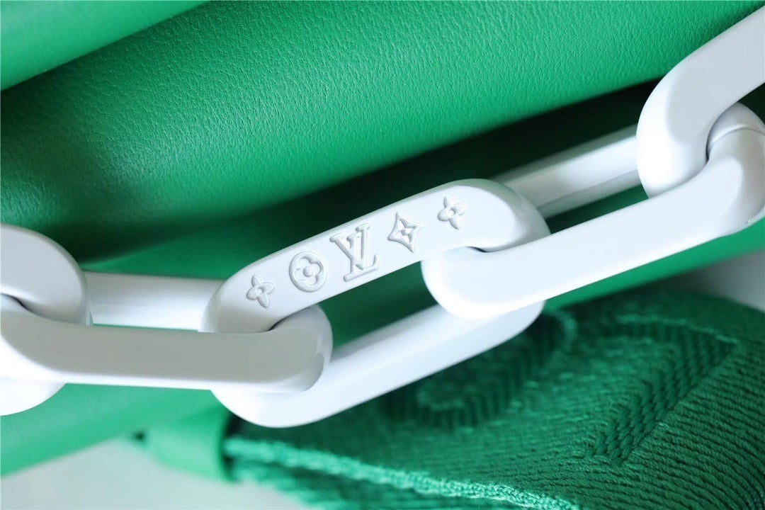 Evocative of the world of tennis, this brightly colored Coussin PM handbag is made from Monogram-embossed with a chunky chain in contrasting white acetate, like the white lines on a tennis court. The chain enables shoulder carry while a wide shoulder strap allows shoulder and cross-body wear; both are detachable.