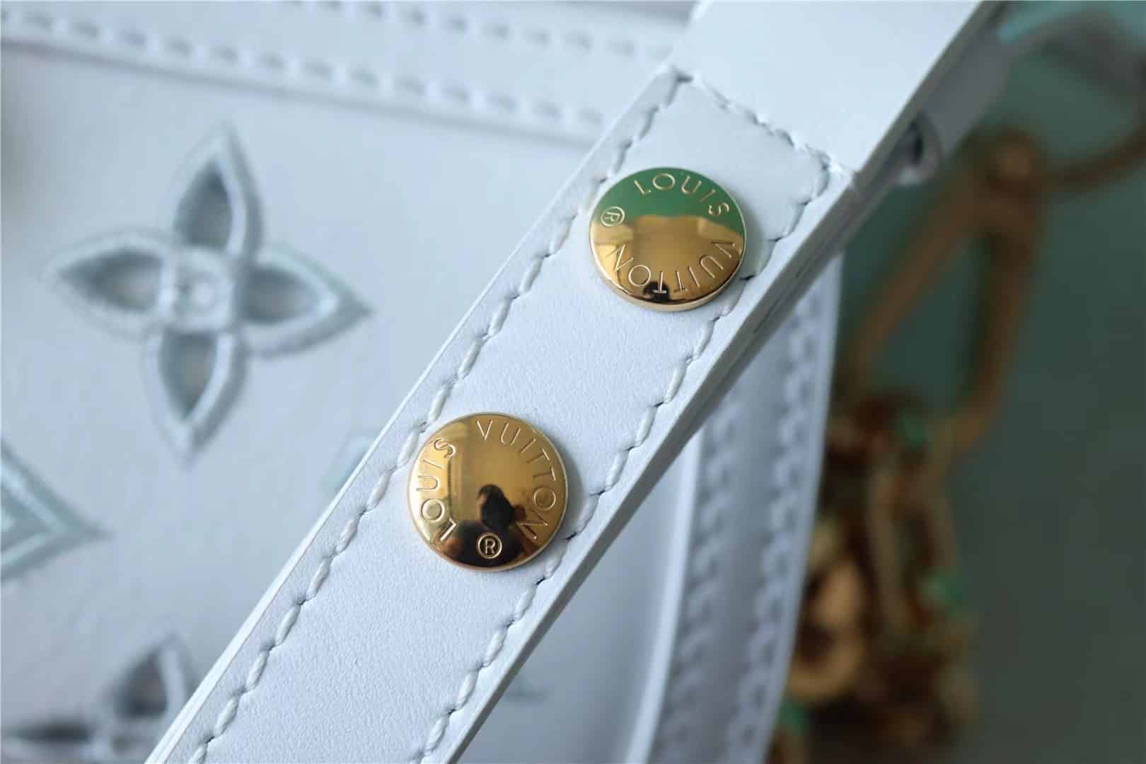 • Part of the LV Broderie Anglaise capsule collection, the elongated Dauphine East West handbag looks stunning with its exquisite reinterpretation of the Monogram pattern as a cut-out pattern. The technique consists of first cutting holes into the to create the Monogram motif and then embellishing the cutouts with bourdon stitches.