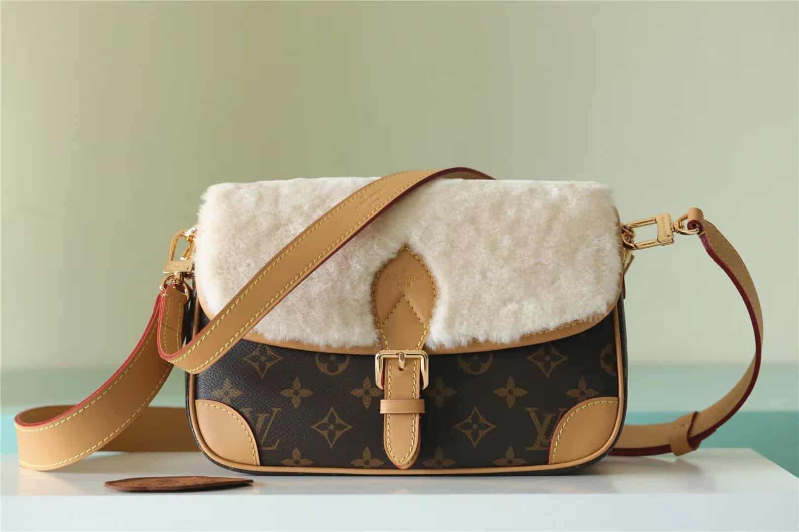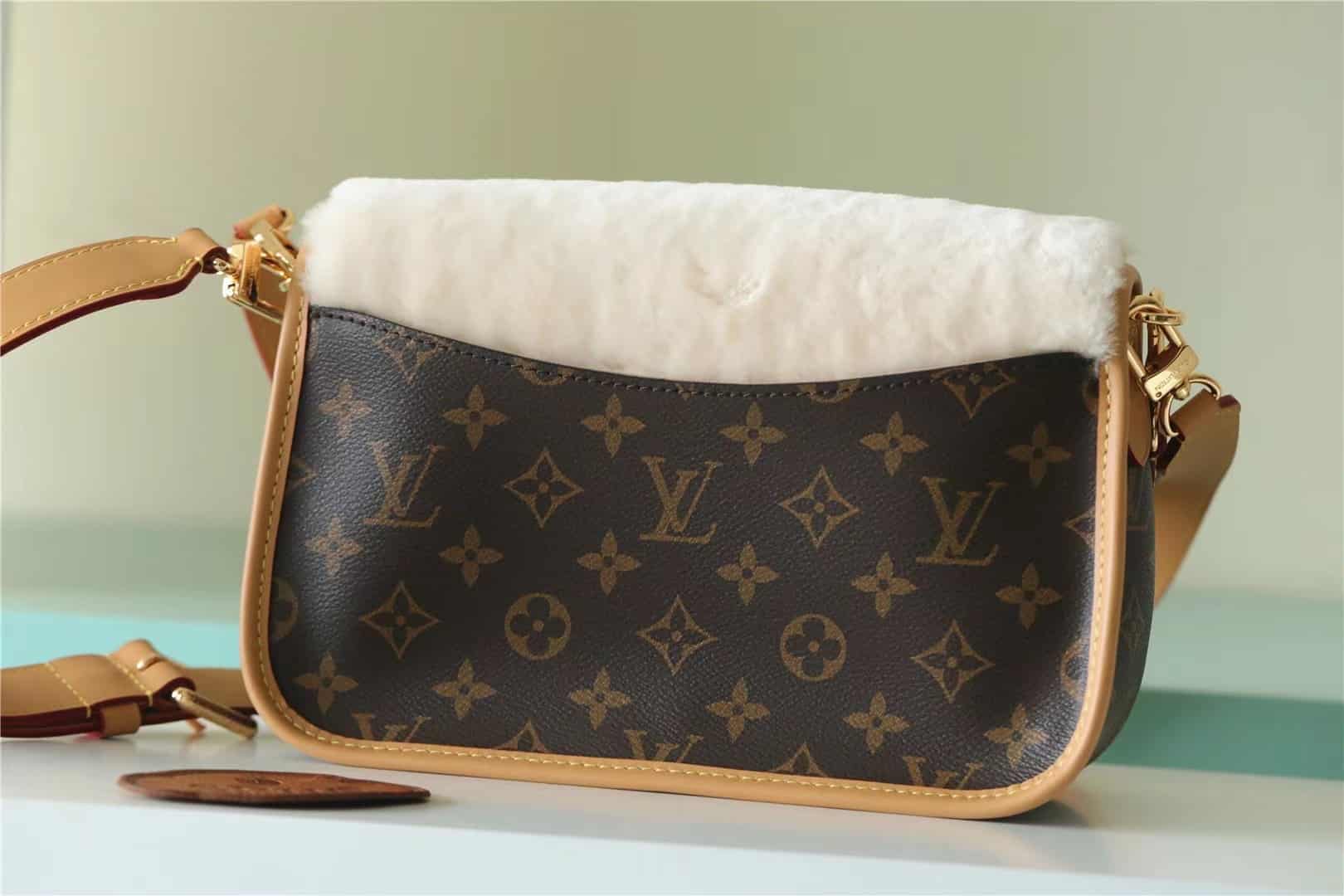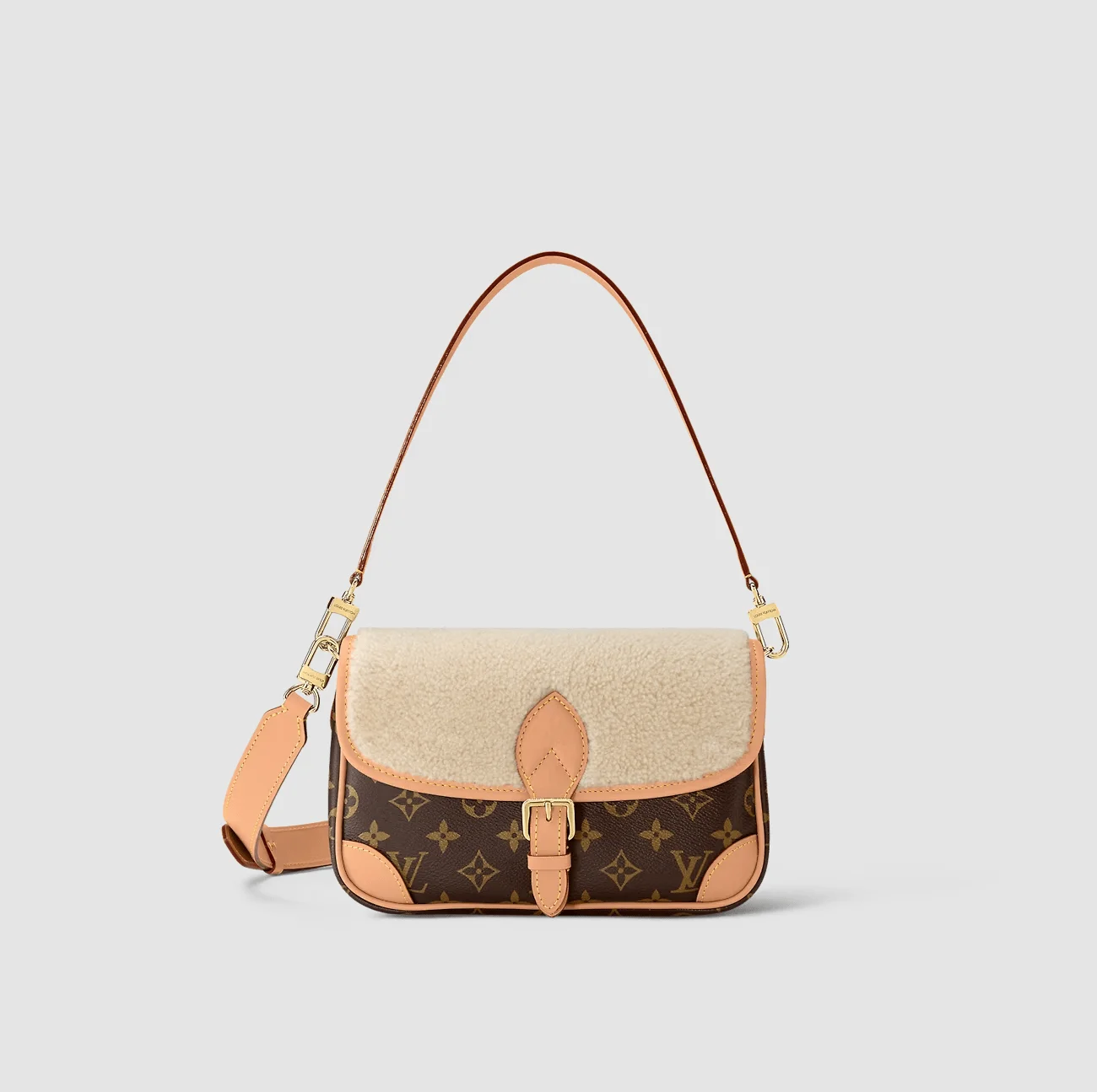 • Soft, cream-hued combines with iconic Monogram canvas in the Diane handbag, new for Winter 2022. Part of the Cozygram capsule collection, this covetable model is detailed with aged natural cowhide trim and gleaming gold-finish hardware. The detachable top handle and long strap offer a range of styling and carry options.