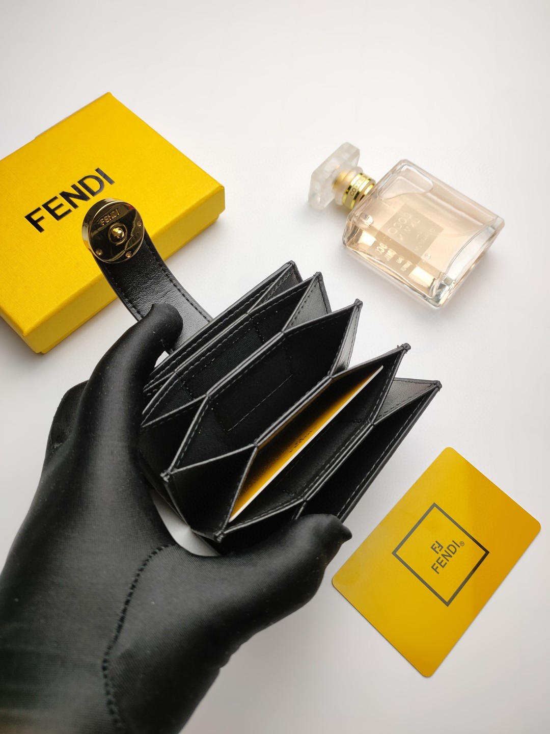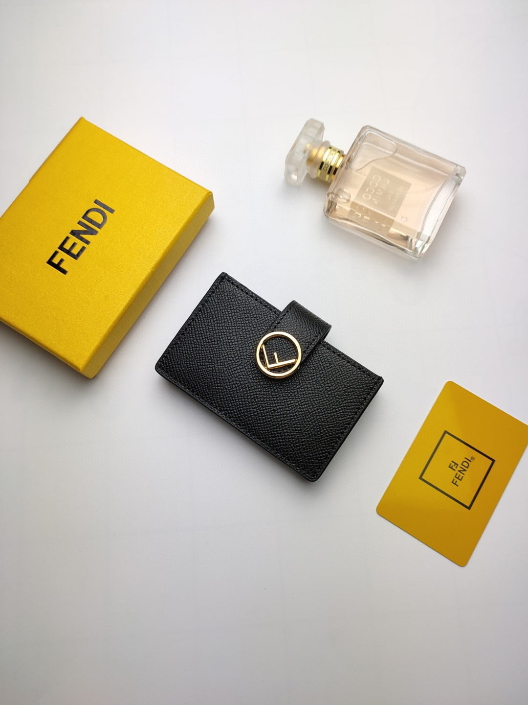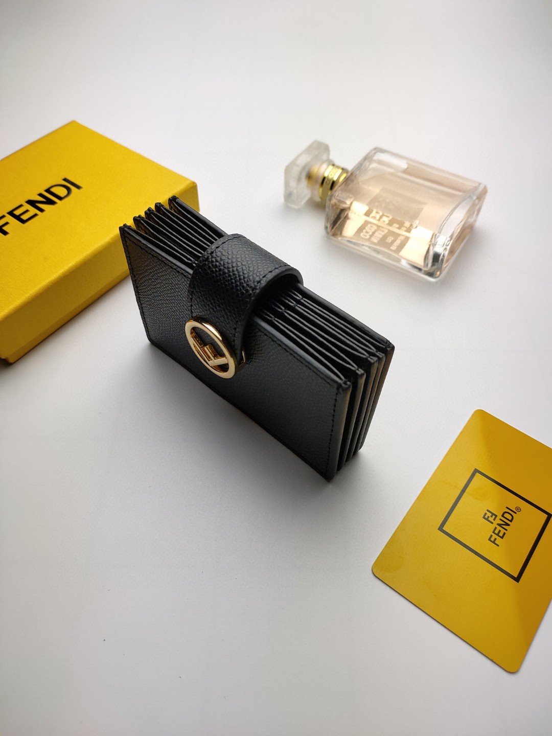 Flat F is Fendi card holder with central compartment and five credit card slots.