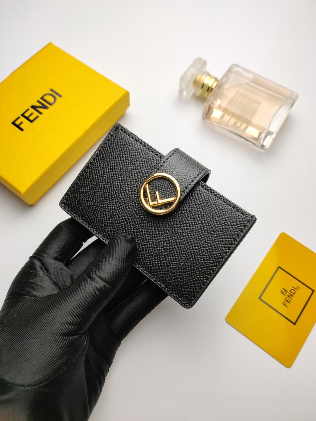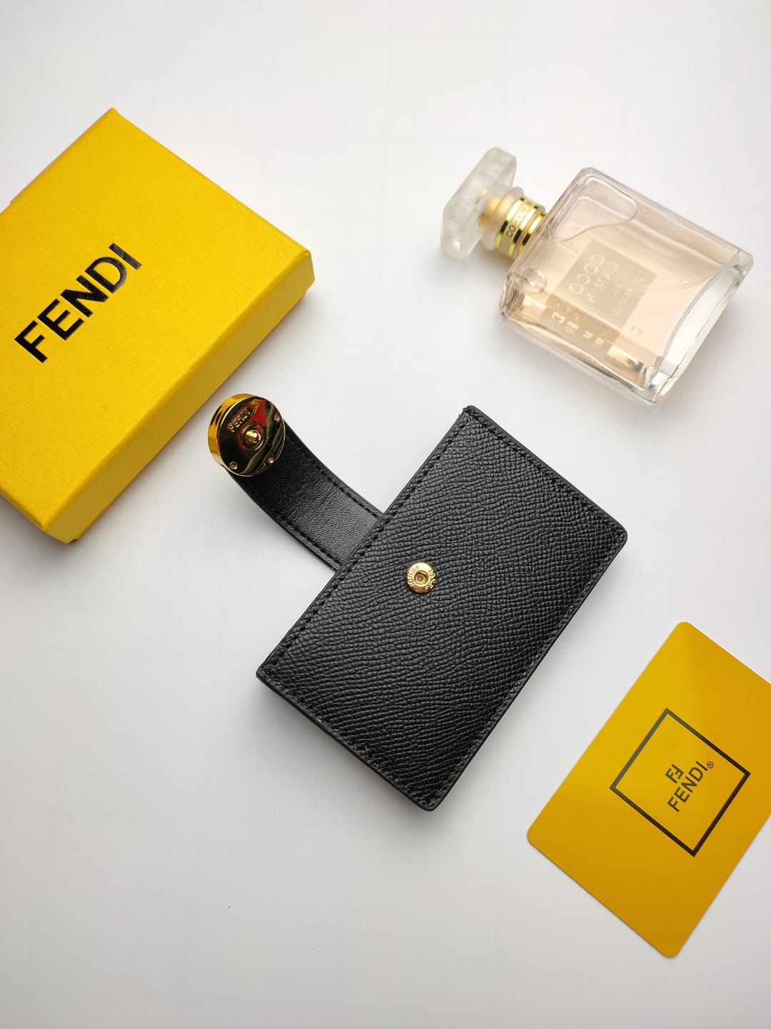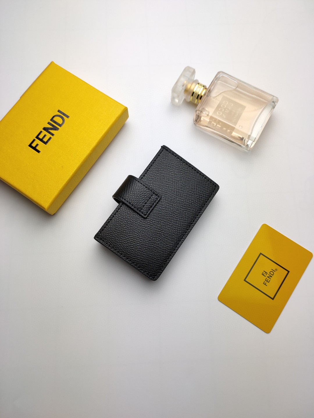 Flat F is Fendi card holder with central compartment and five credit card slots.