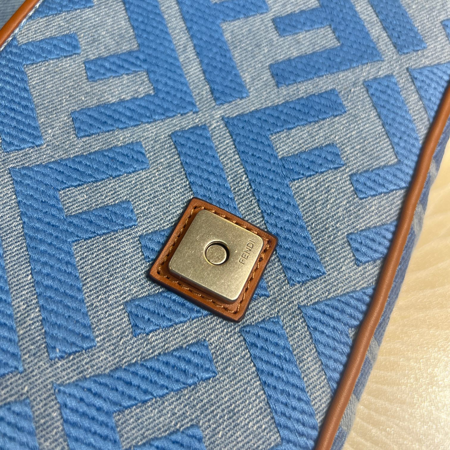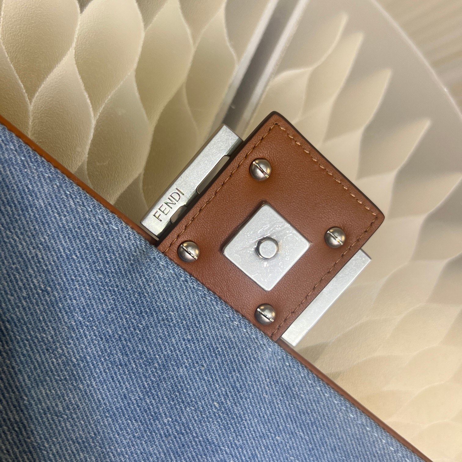 • Iconic mini Baguette bag made of light blue denim with a tone on tone FF motif in a raised embroidery. Finished with a brown and embellished with an FF clasp.