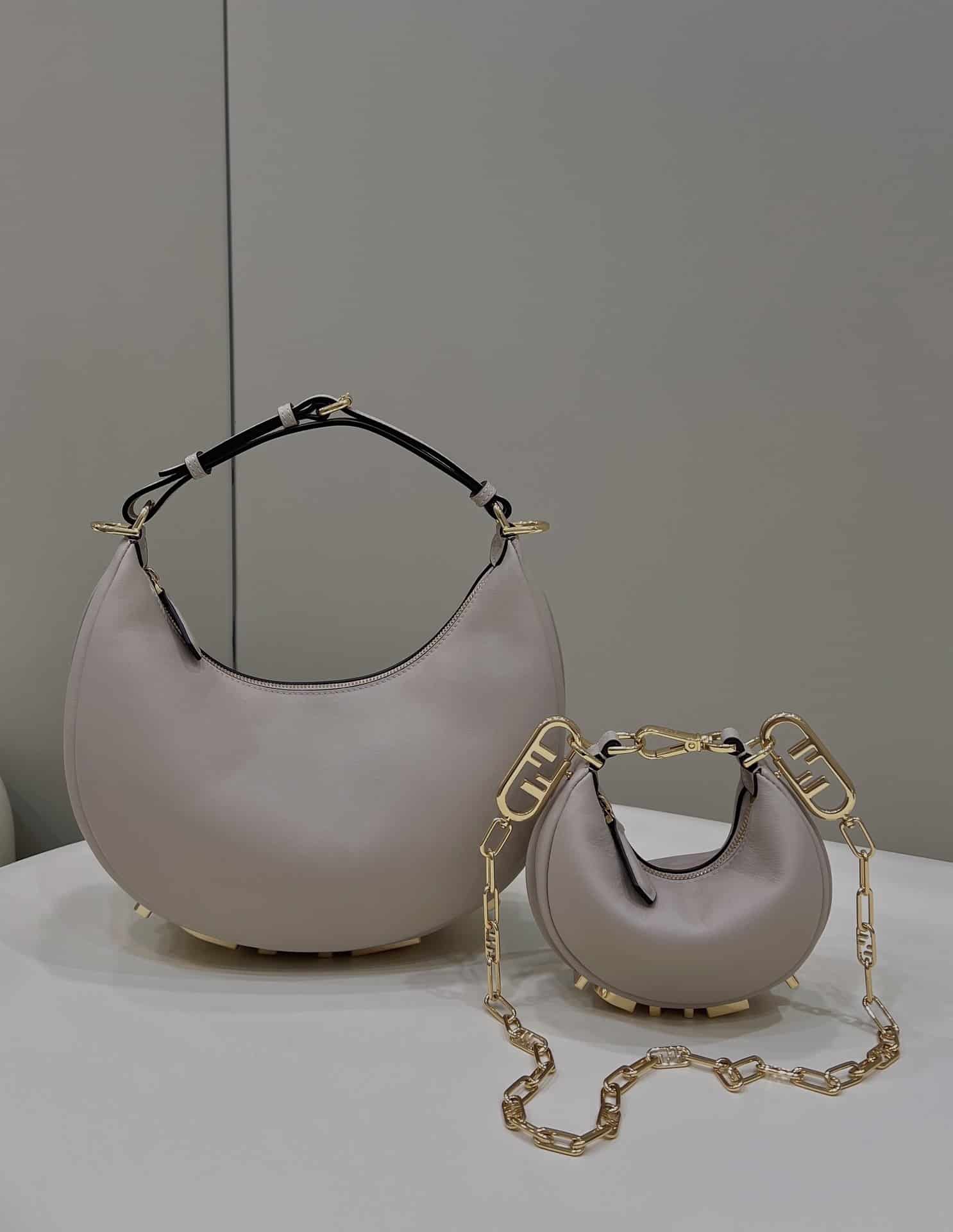 Mini hobo bag made of soft beige leather, decorated with vintage gold metal FENDI lettering visible when wearing the bag under the arm.