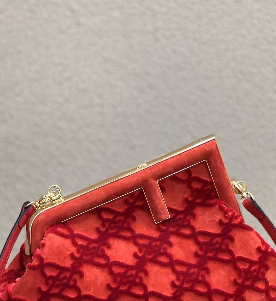 Small Fendi First bag made of soft, red nappa leather with oversized metal F clasp bound in tone on tone suede.