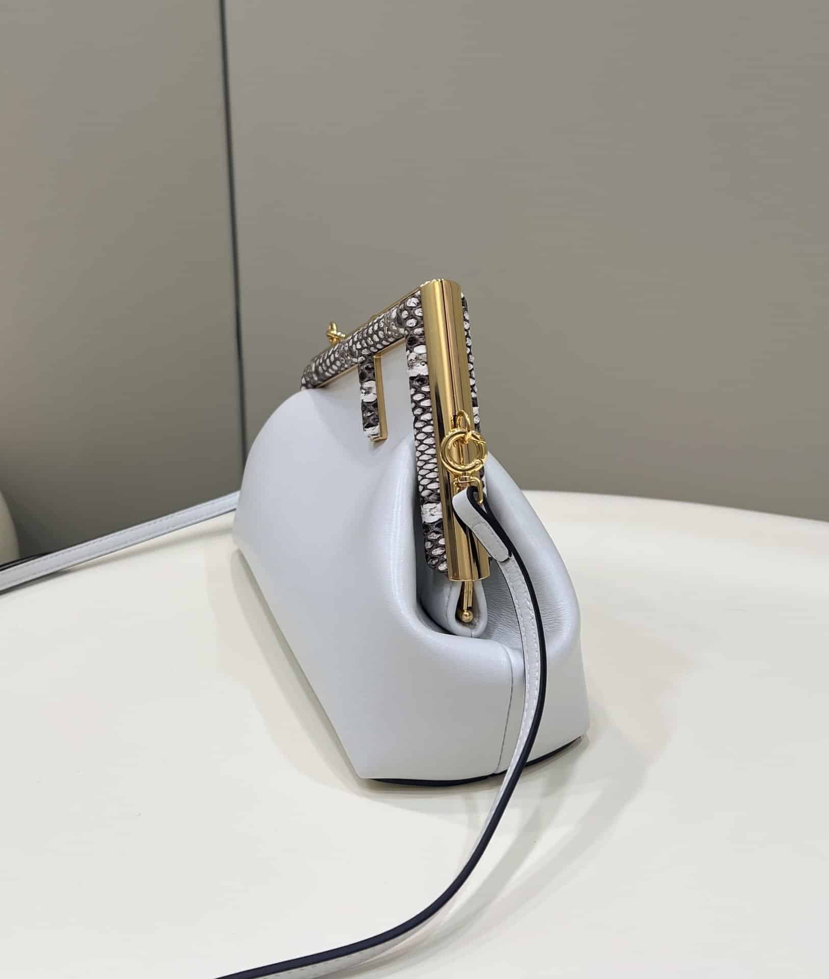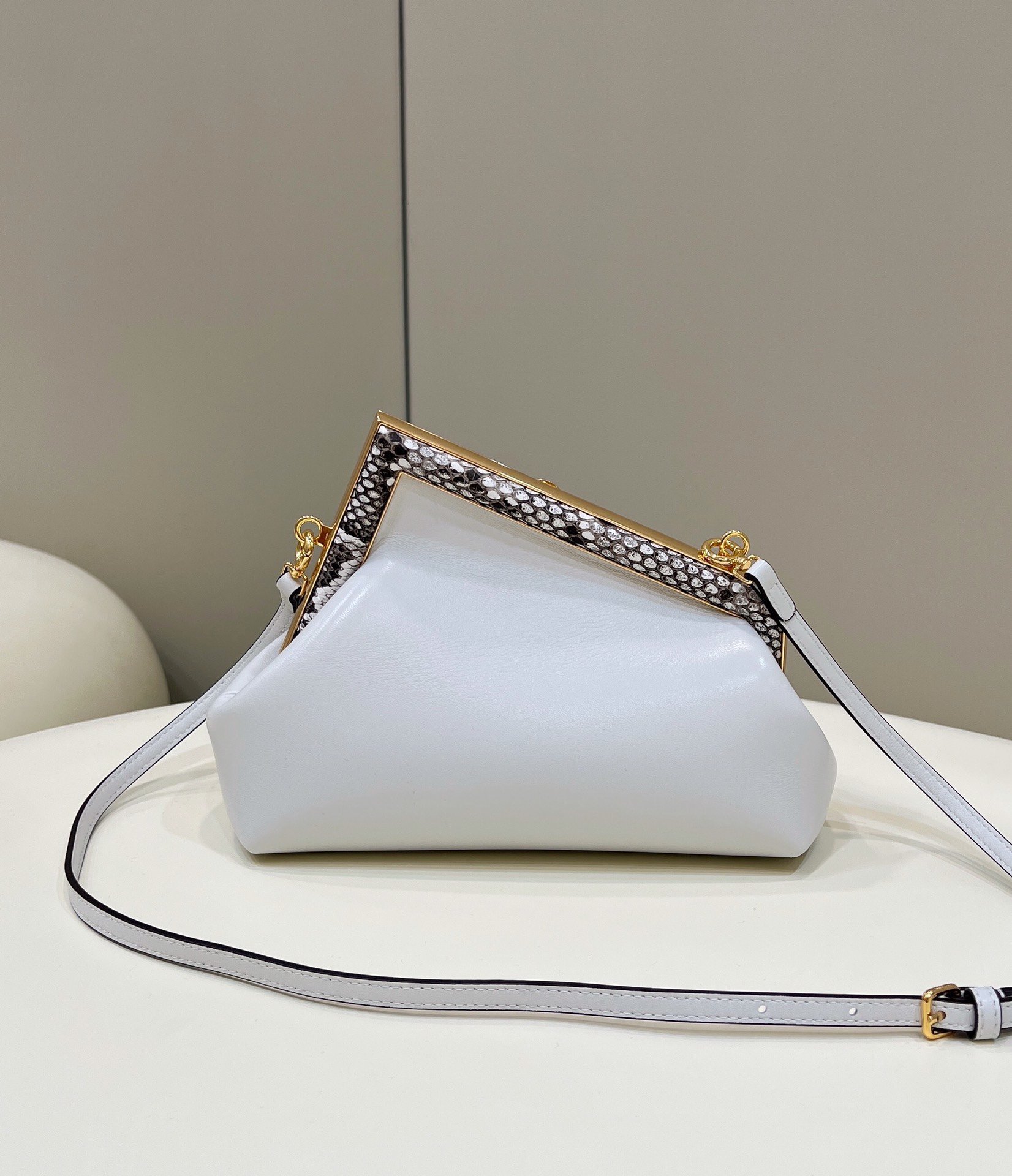 Small Fendi First bag made of soft, white nappa with oversized metal F clasp wrapped in tone on tone python. Can be carried by hand as a clutch or worn on the shoulder thanks to the detachable shoulder strap.