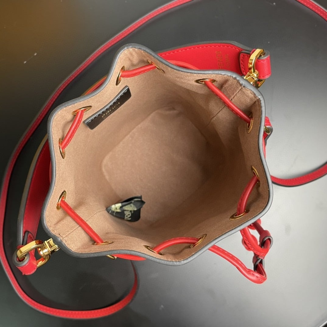 Mini Mon Tresor bucket bag with drawstring fastening and metal decorations in the Fendi logo shape. Two detachable shoulder straps, one long and one short, to carry the bag in the hand, over the shoulder or cross-body. Made of red calfskin. Iconic FF pattern printed in relief and hand-painted. Gold-finish metalware.