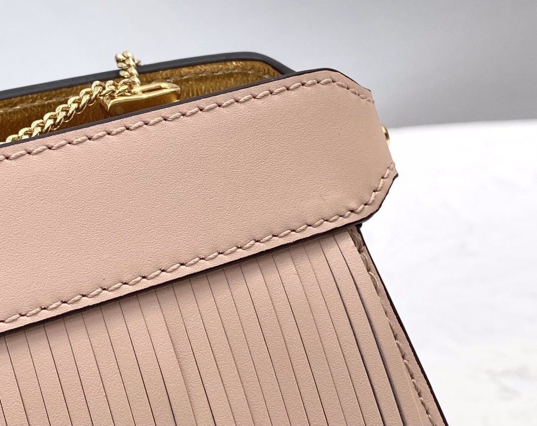 Iconic Peekaboo ISeeU small bag made from pink leather, finished with long leather fringes with a gold laminated bottom. Decorated with iconic twist lock on both sides.
