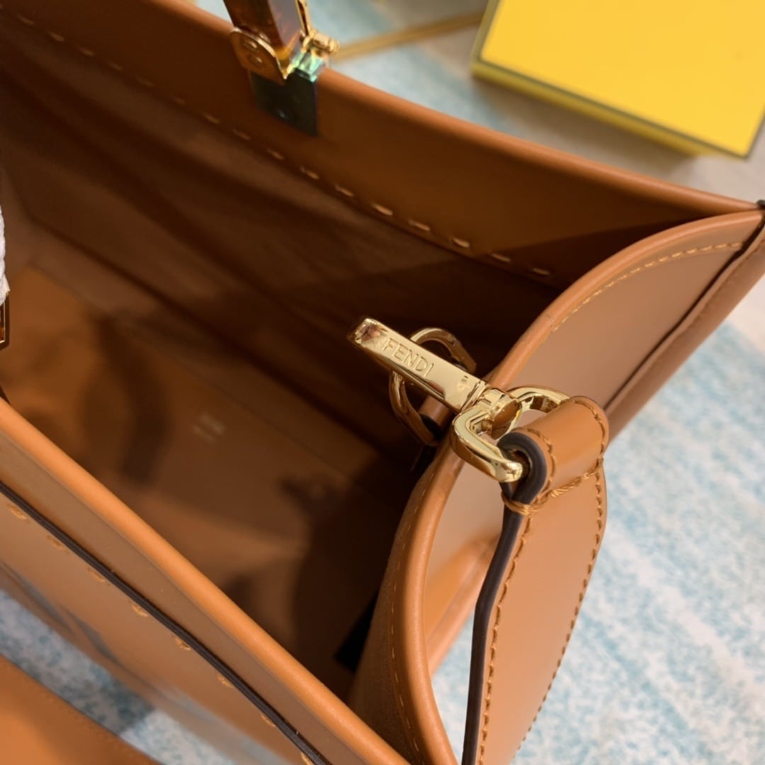 Medium Sunshine Shopper bag made from brown with hot-stamped “FENDI ROMA” and stiff tortoiseshell plexiglass handles. Can be carried by hand or worn on the shoulder thanks to the two handles and detachable shoulder strap.