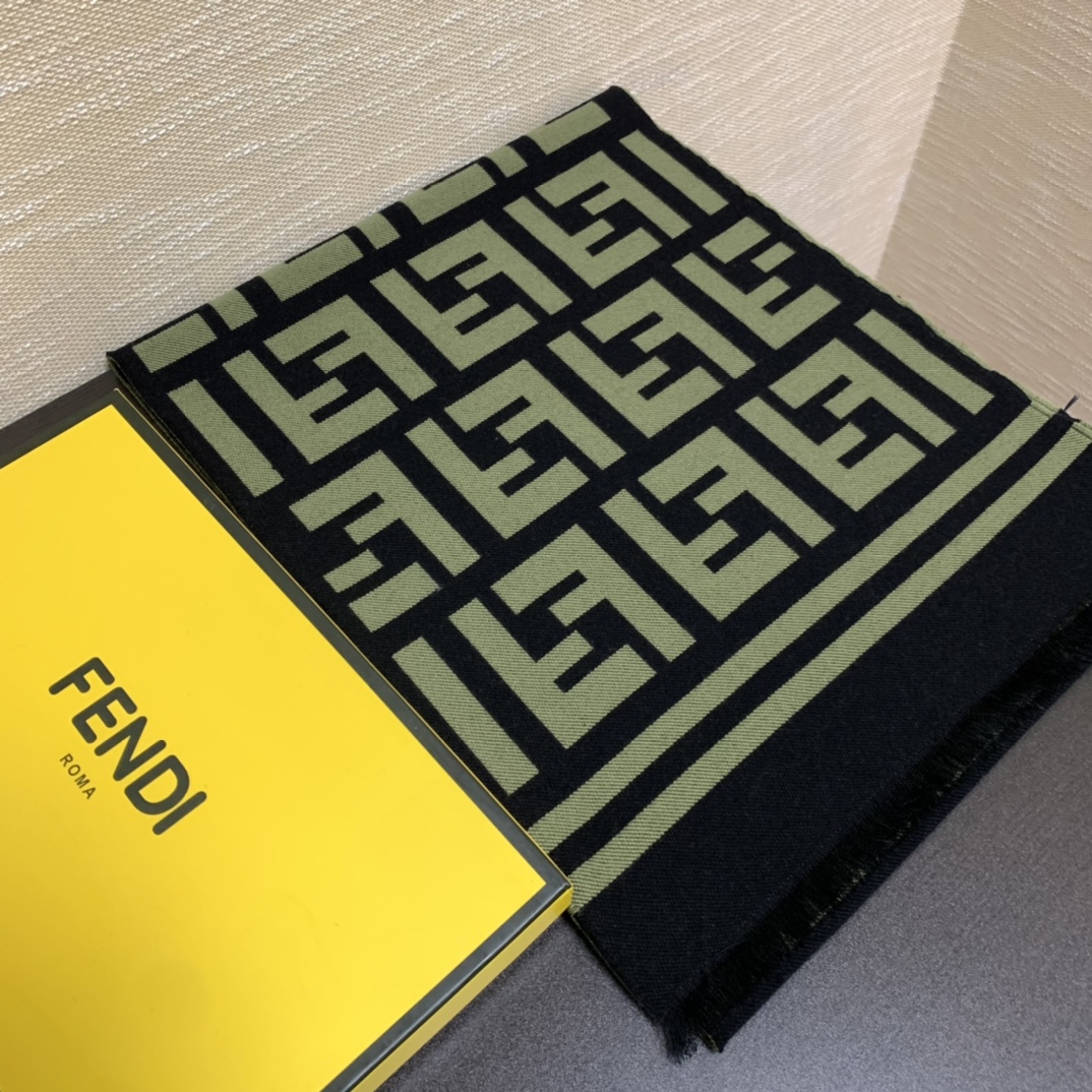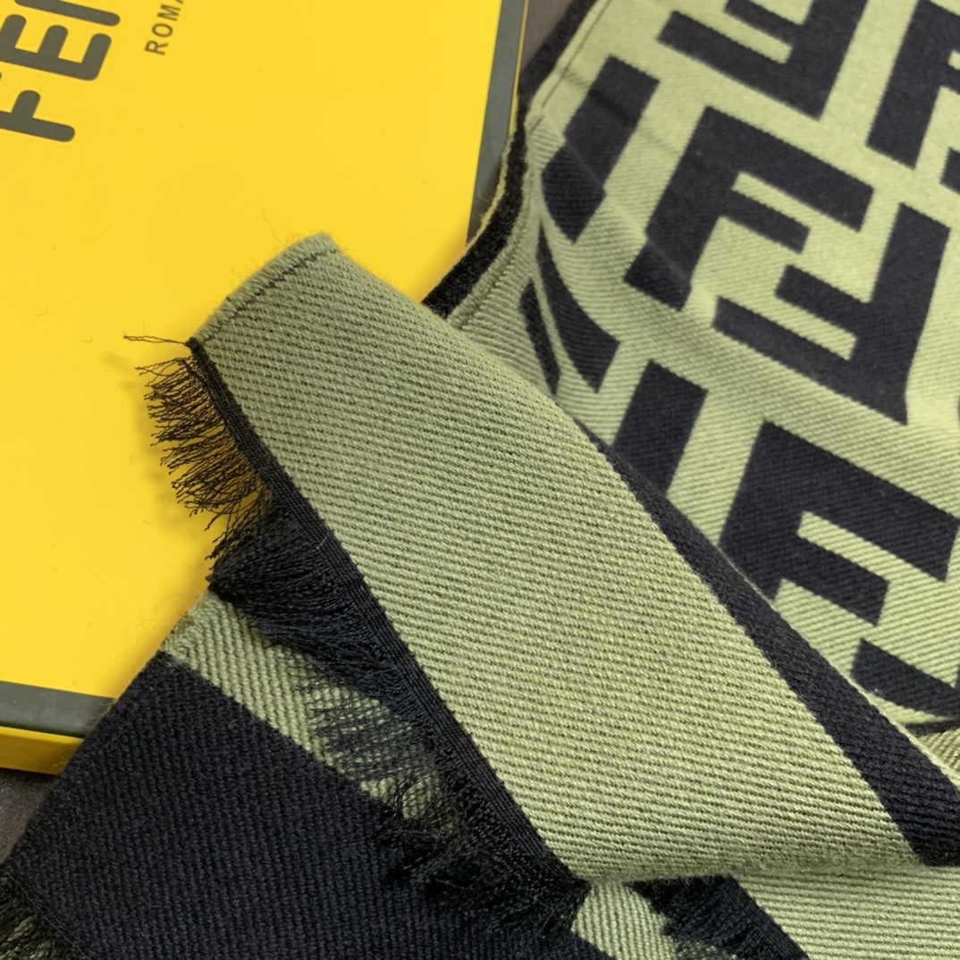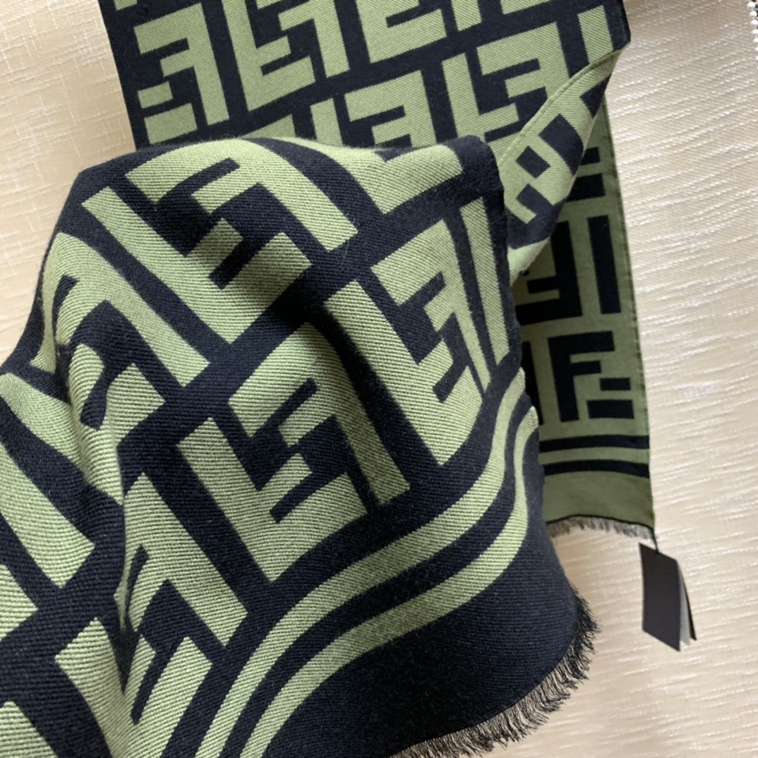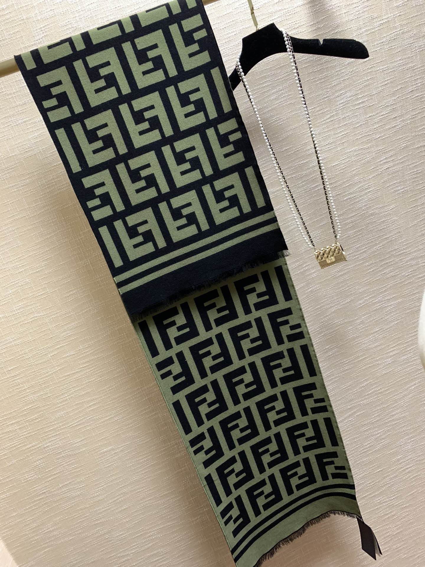 Rectangular wool and silk knitted scarf with all-over FF motif. Trimmed with a striped border in matching tones.