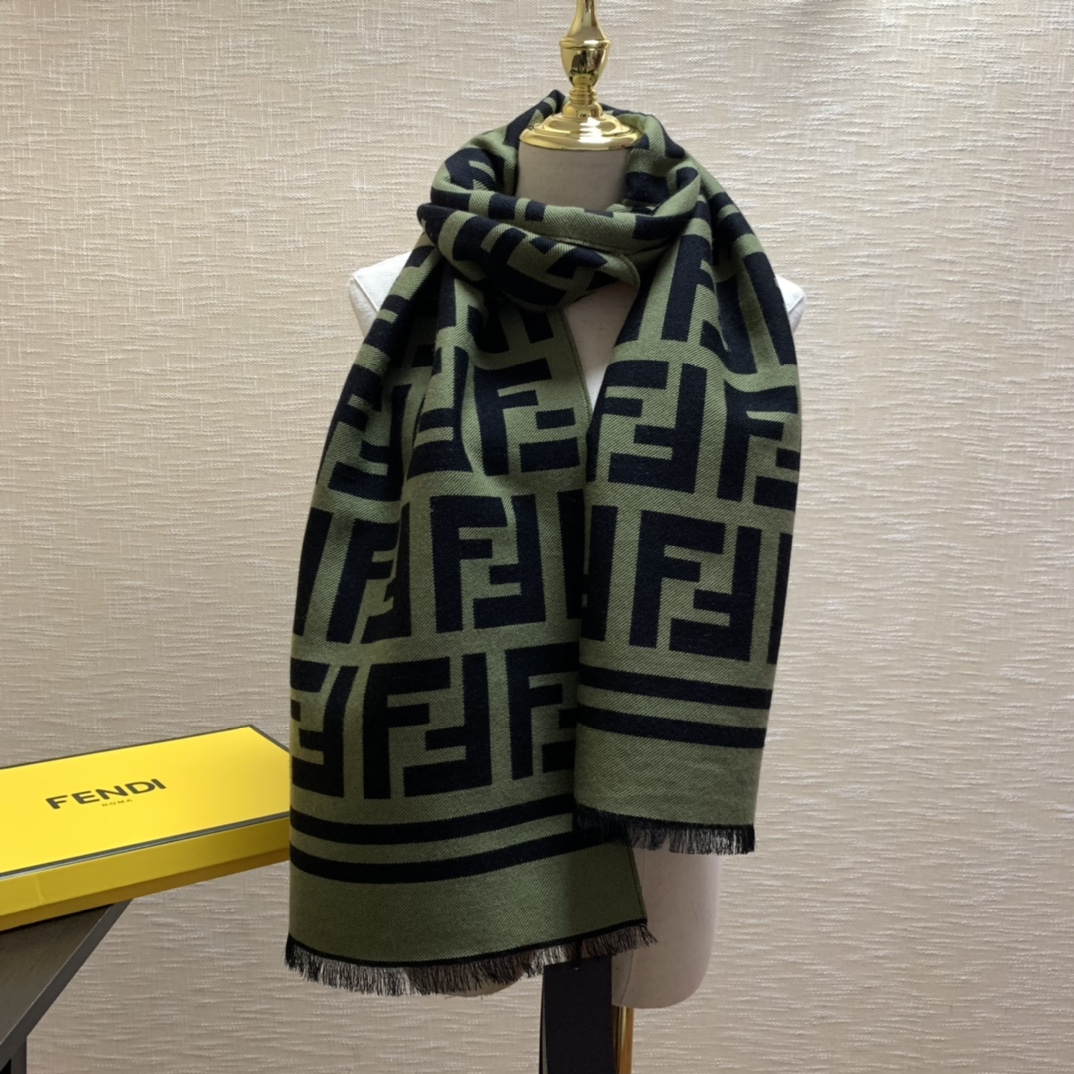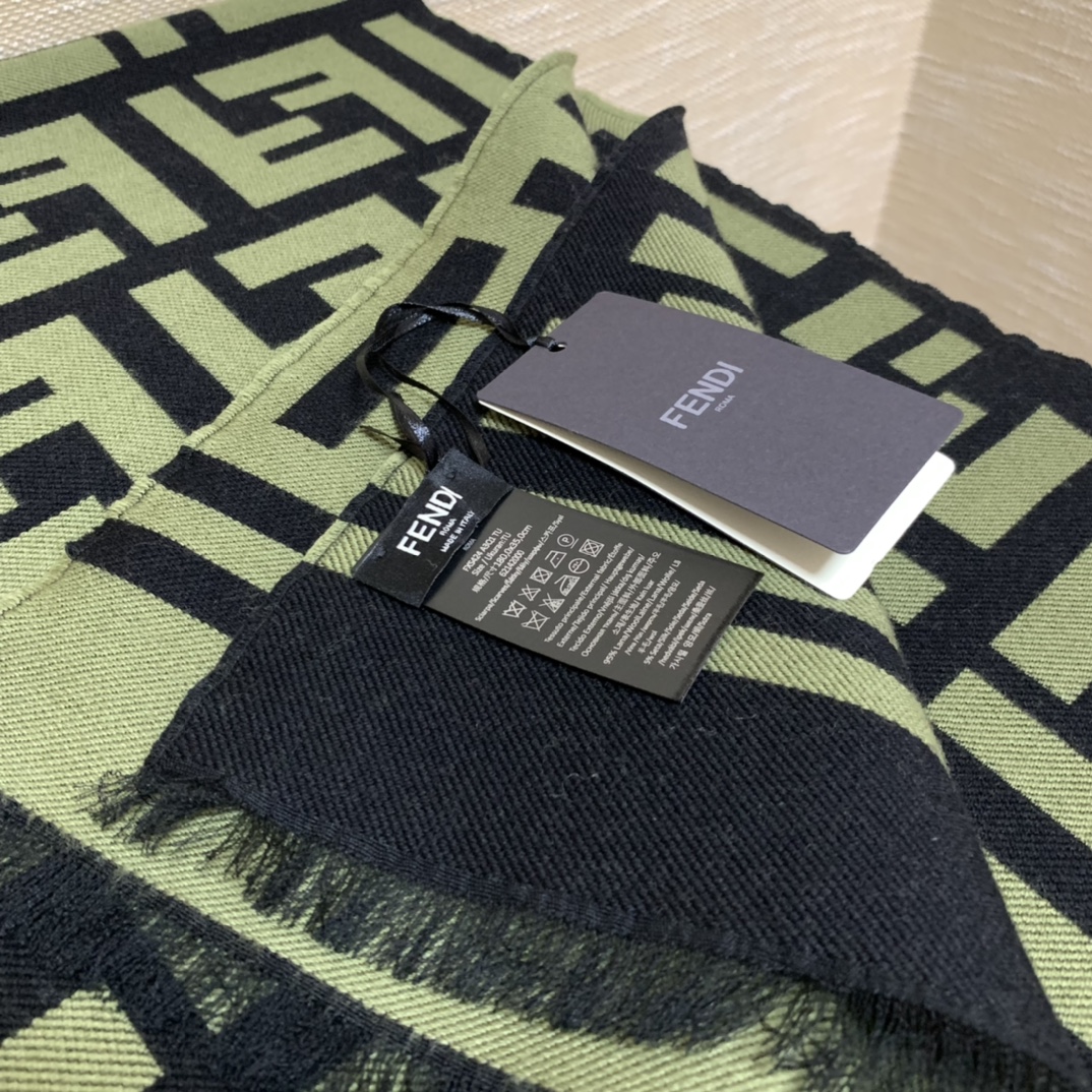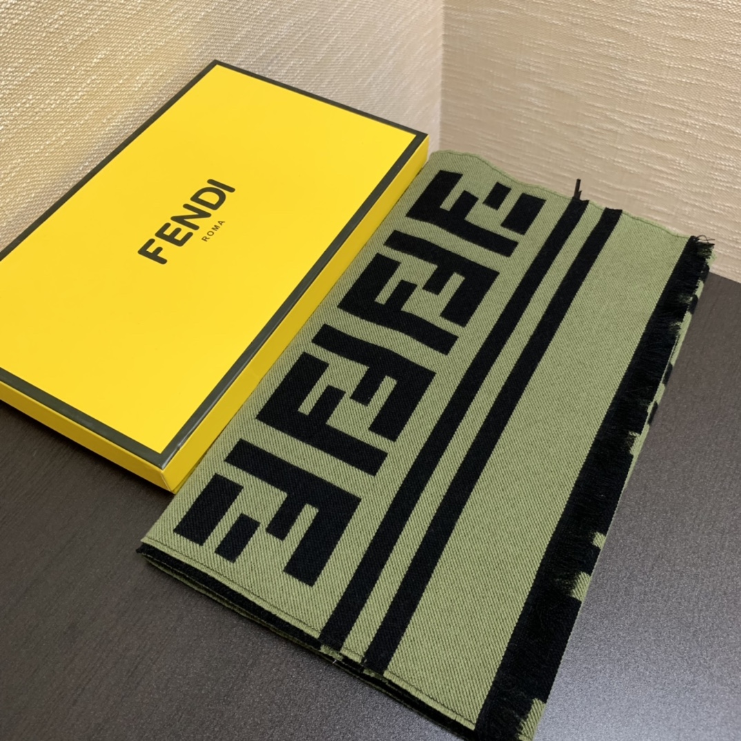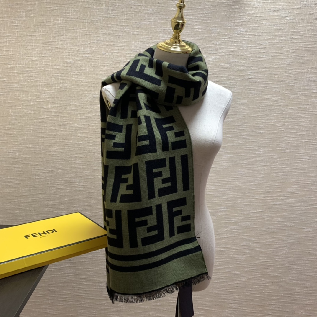Rectangular wool and silk knitted scarf with all-over FF motif. Trimmed with a striped border in matching tones.