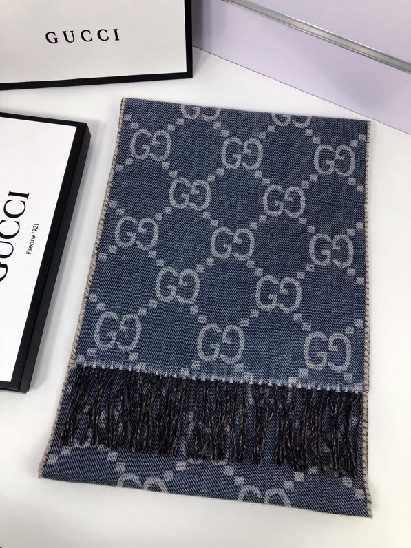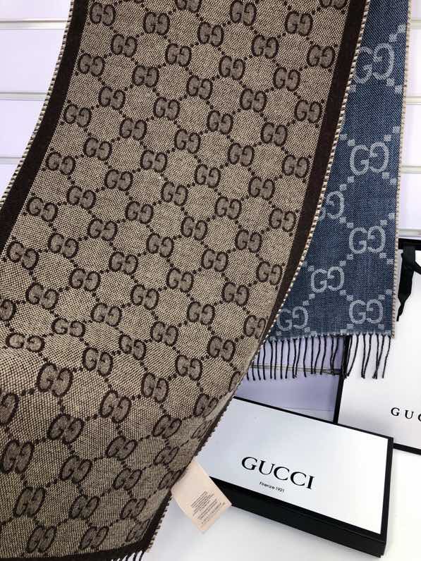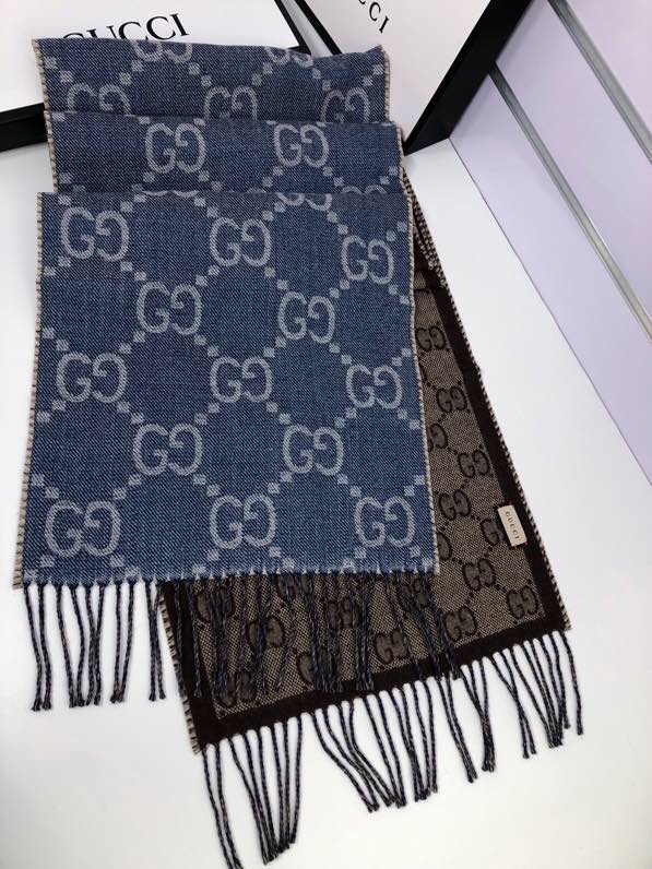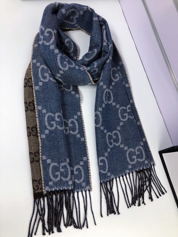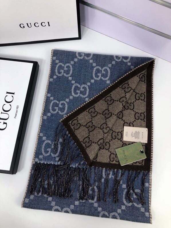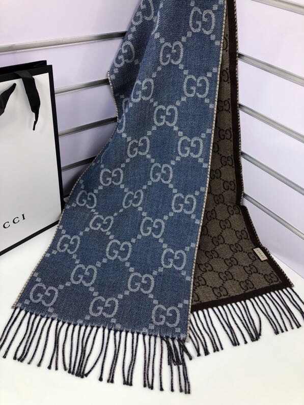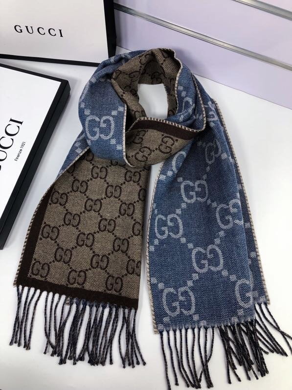 Gucci GG Jacquard Knit Scarf With Tassels Blue/Brown 67in/170cm