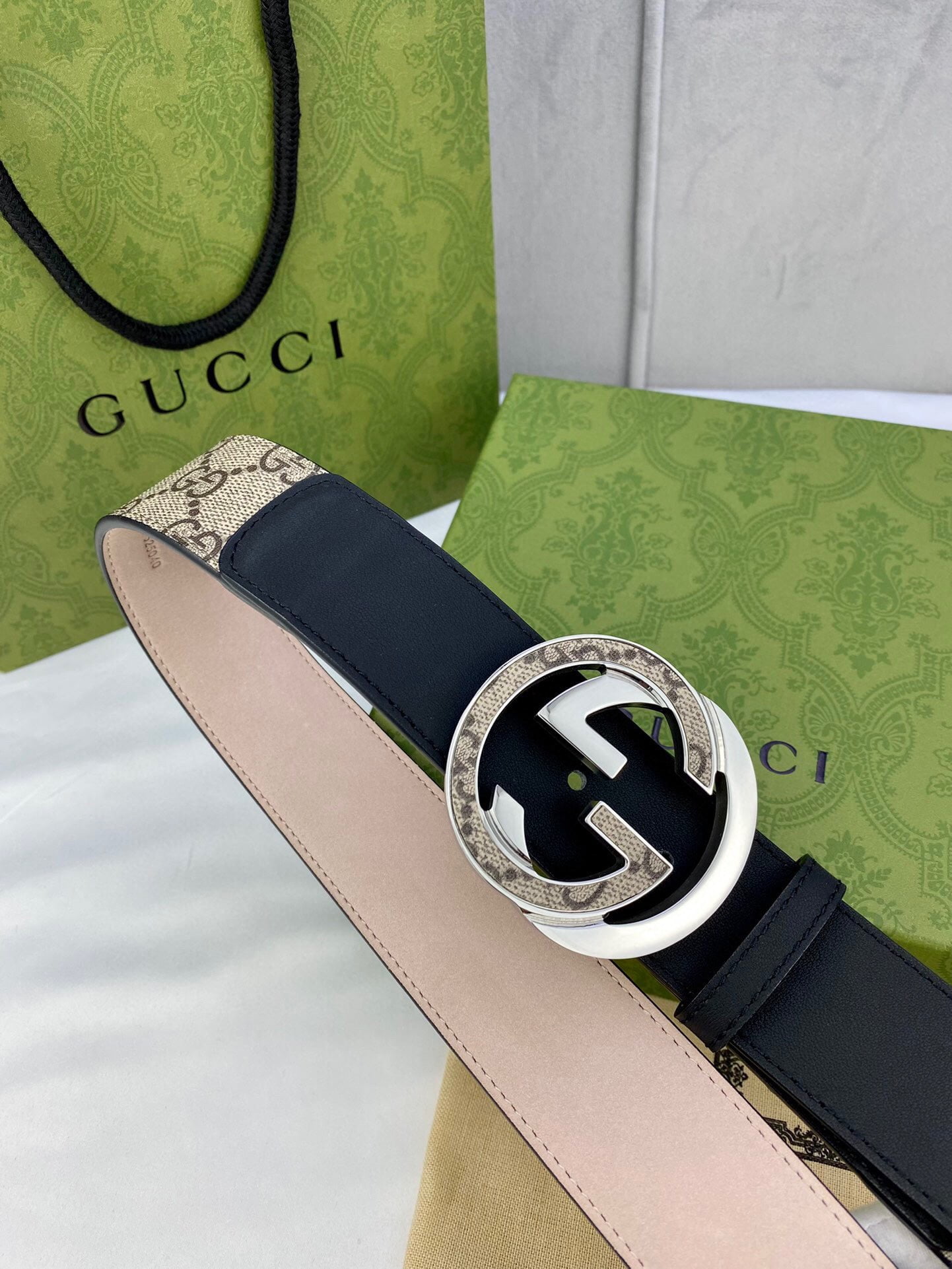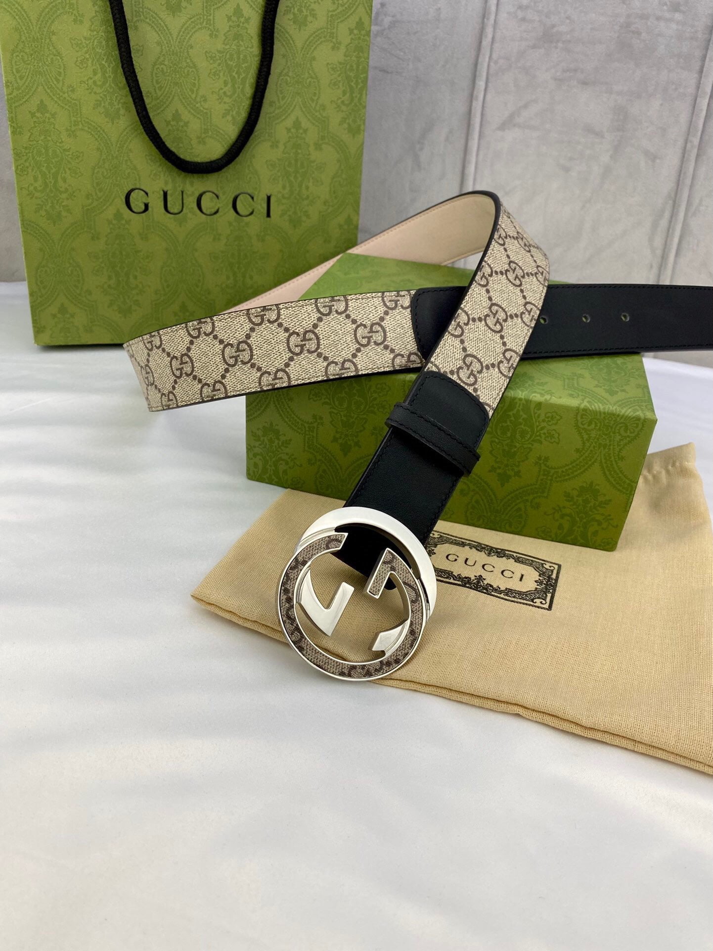 Gucci GG Supreme Belt With Interlocking G Buckle Beige/Ebony And Black GG Supreme Canvas For Women, Women Belt