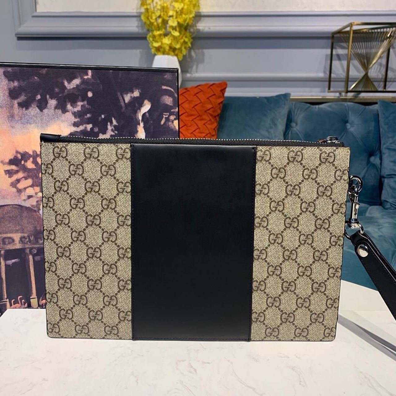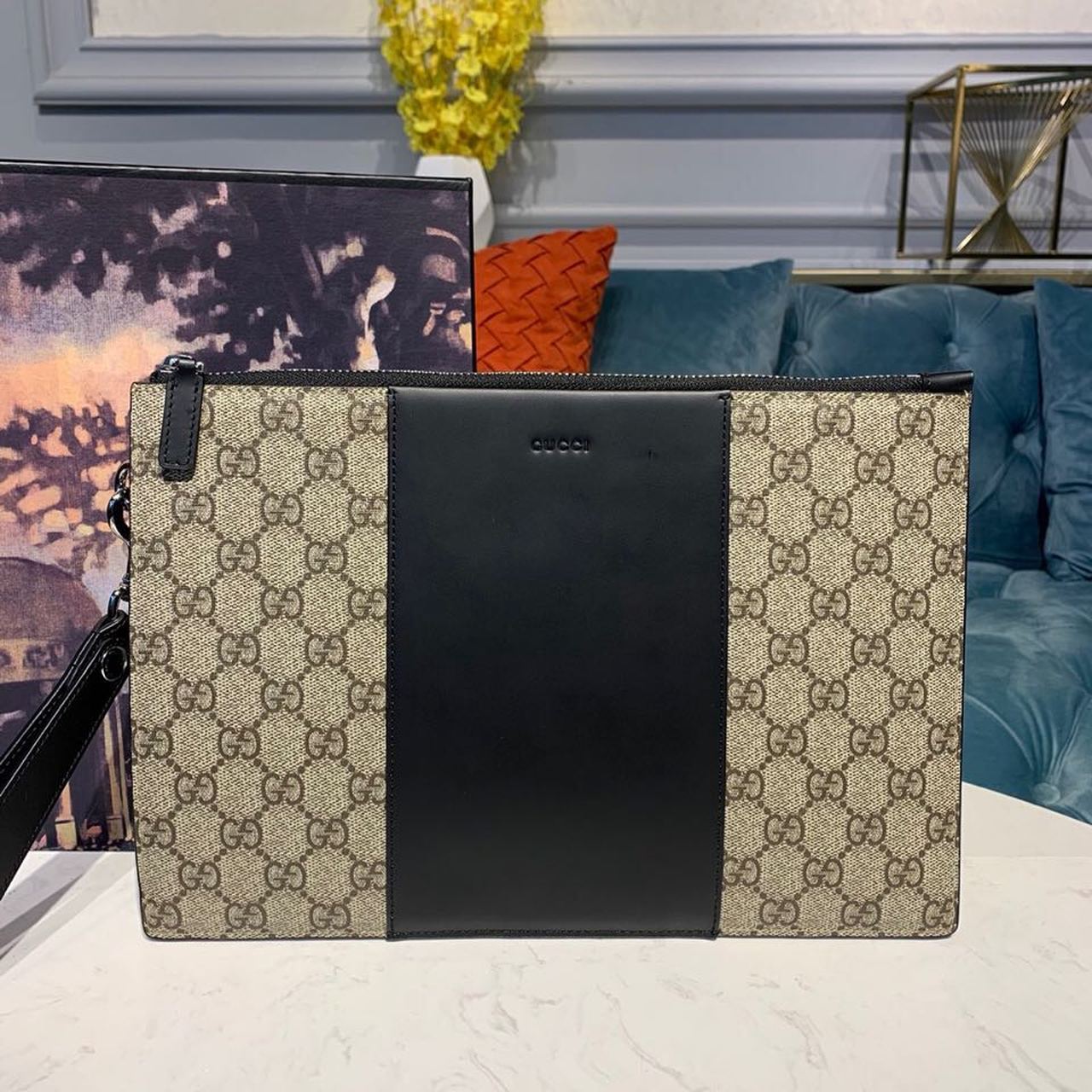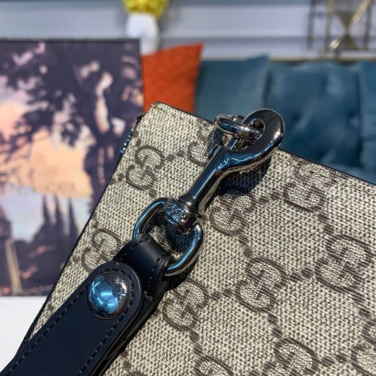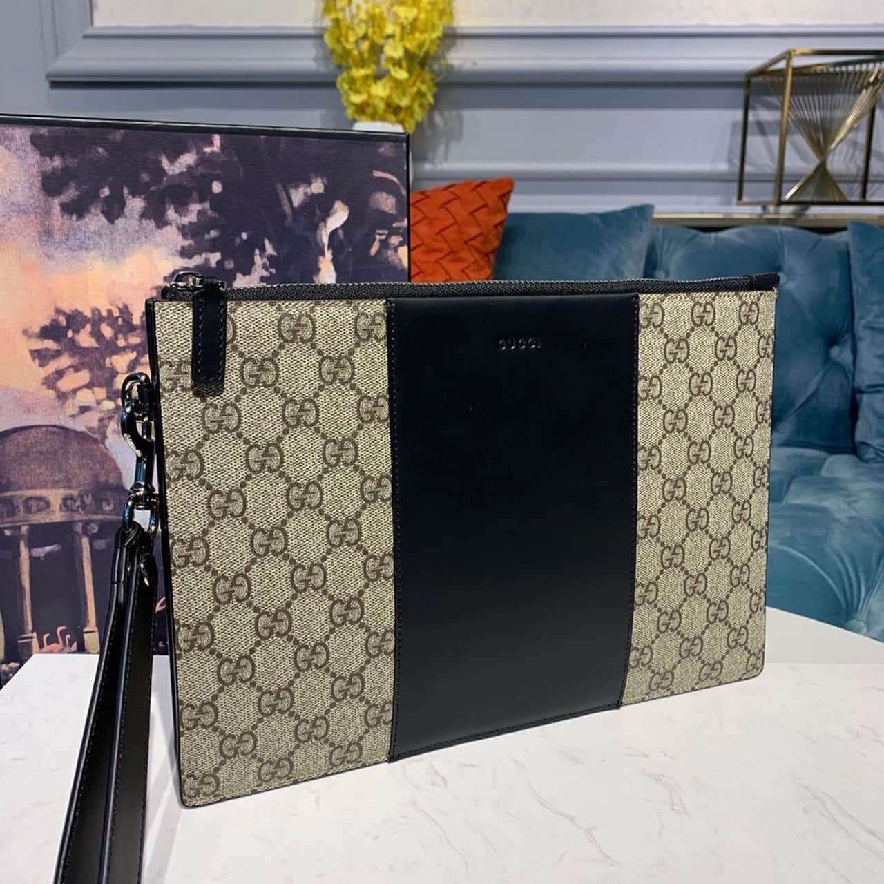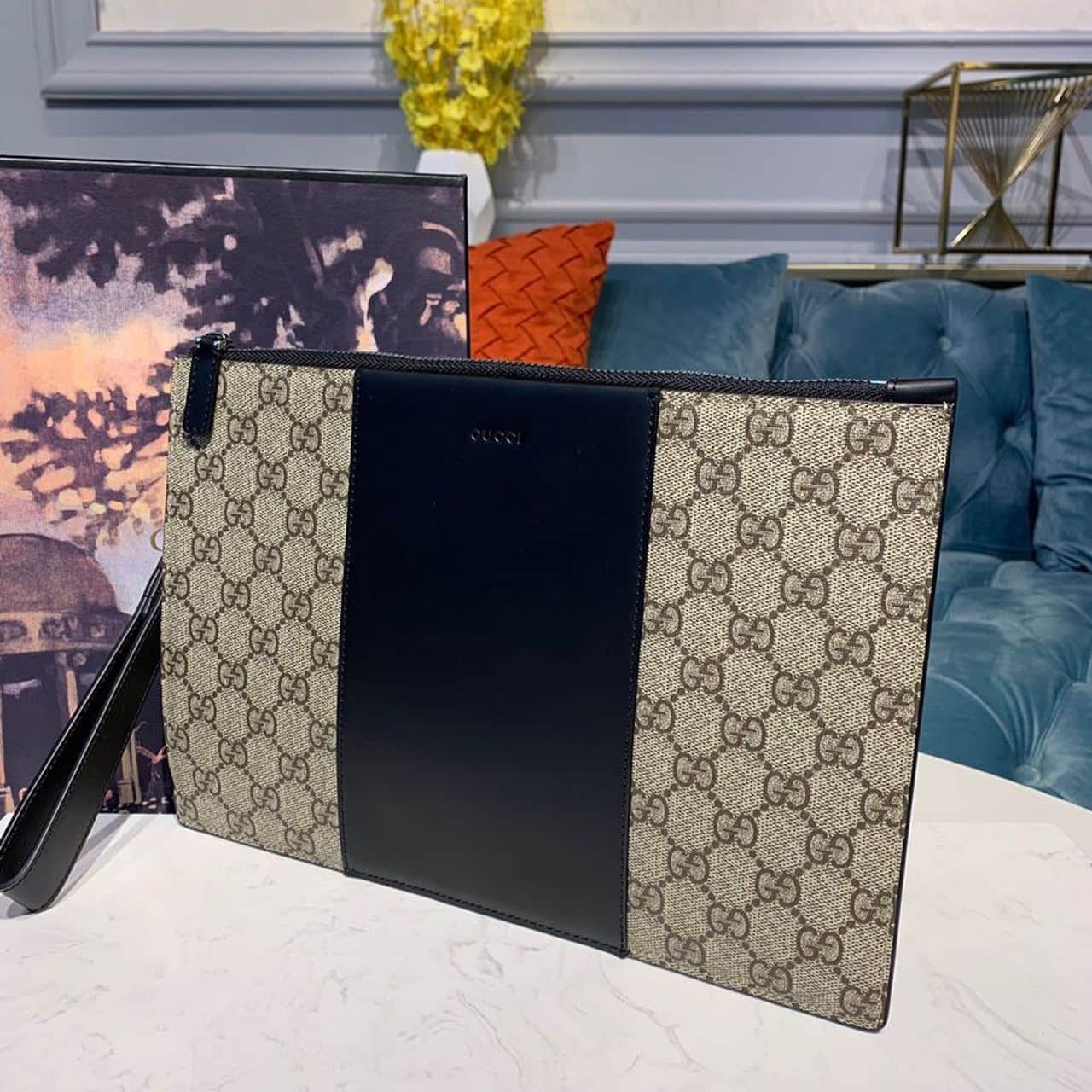 1:1 Replica Gucci GG Supreme Pouch Beige/Ebony GG Supreme Canvas For Men 12in/30cm GG 495017 KGDHN 9769