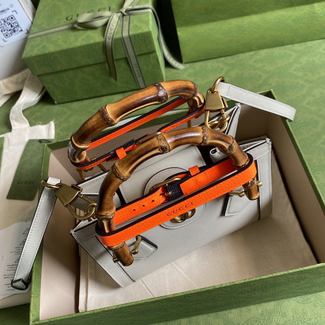 An evolution of a bamboo handle tote first introduced in 1991, the Gucci Diana represents the notion of style in constant evolution and is reimagined with removable, Orange belts a nod to the functional bands used to keep the handles in shape. Here, a mini version of the emblematic style is presented in white
