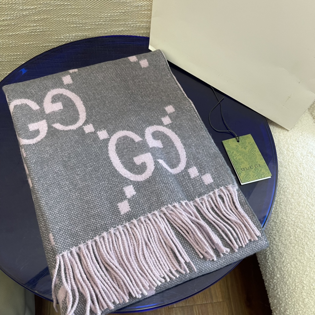 Refined with fringe edges, this double jacquard wool scarf features the House’s trademark GG pattern, first introduced in the ’70s.