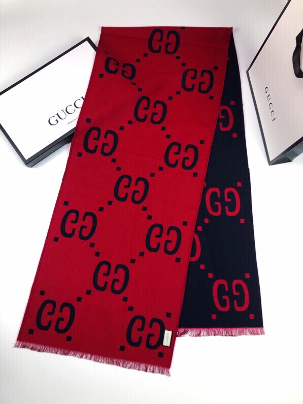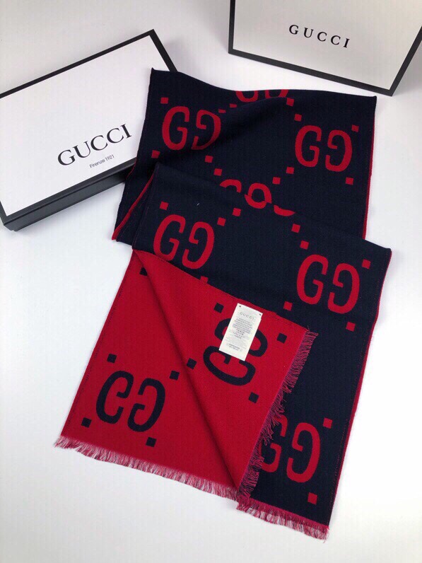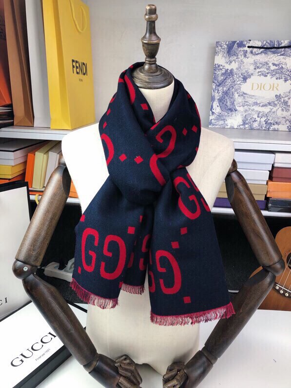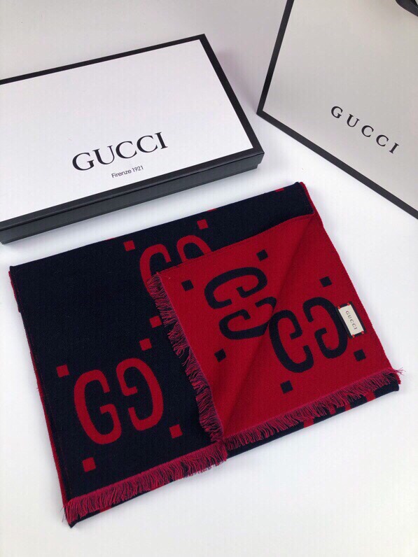 Gucci Wool Silk Jacquard Monogram Blue/ Red Scarf 180cm/71in 495592 4G350 4074