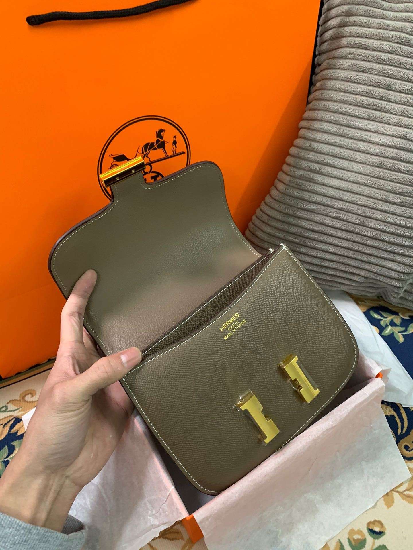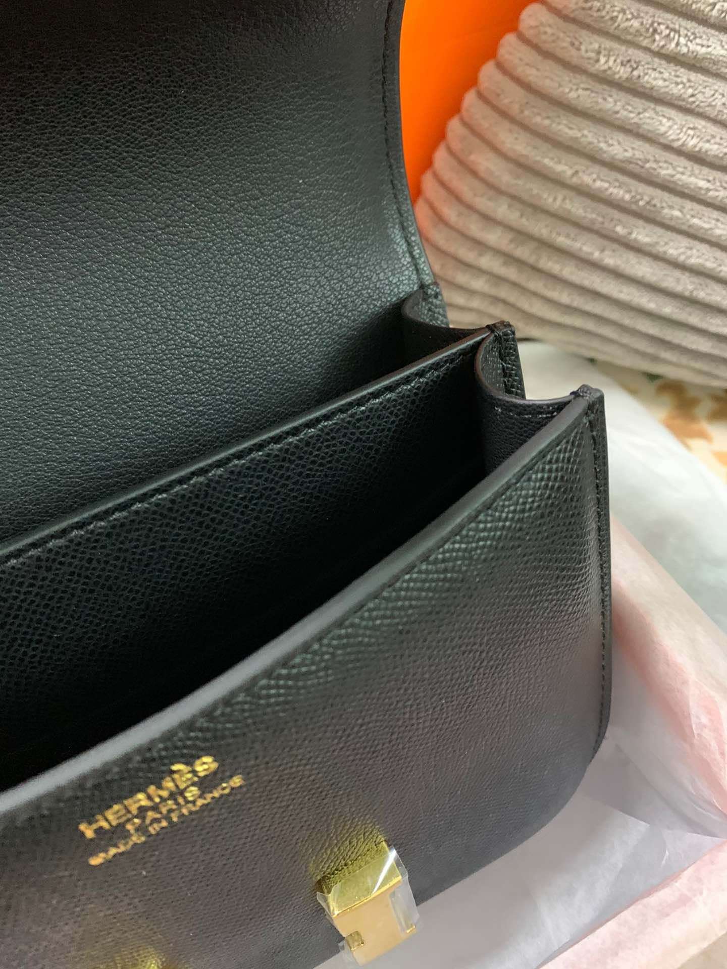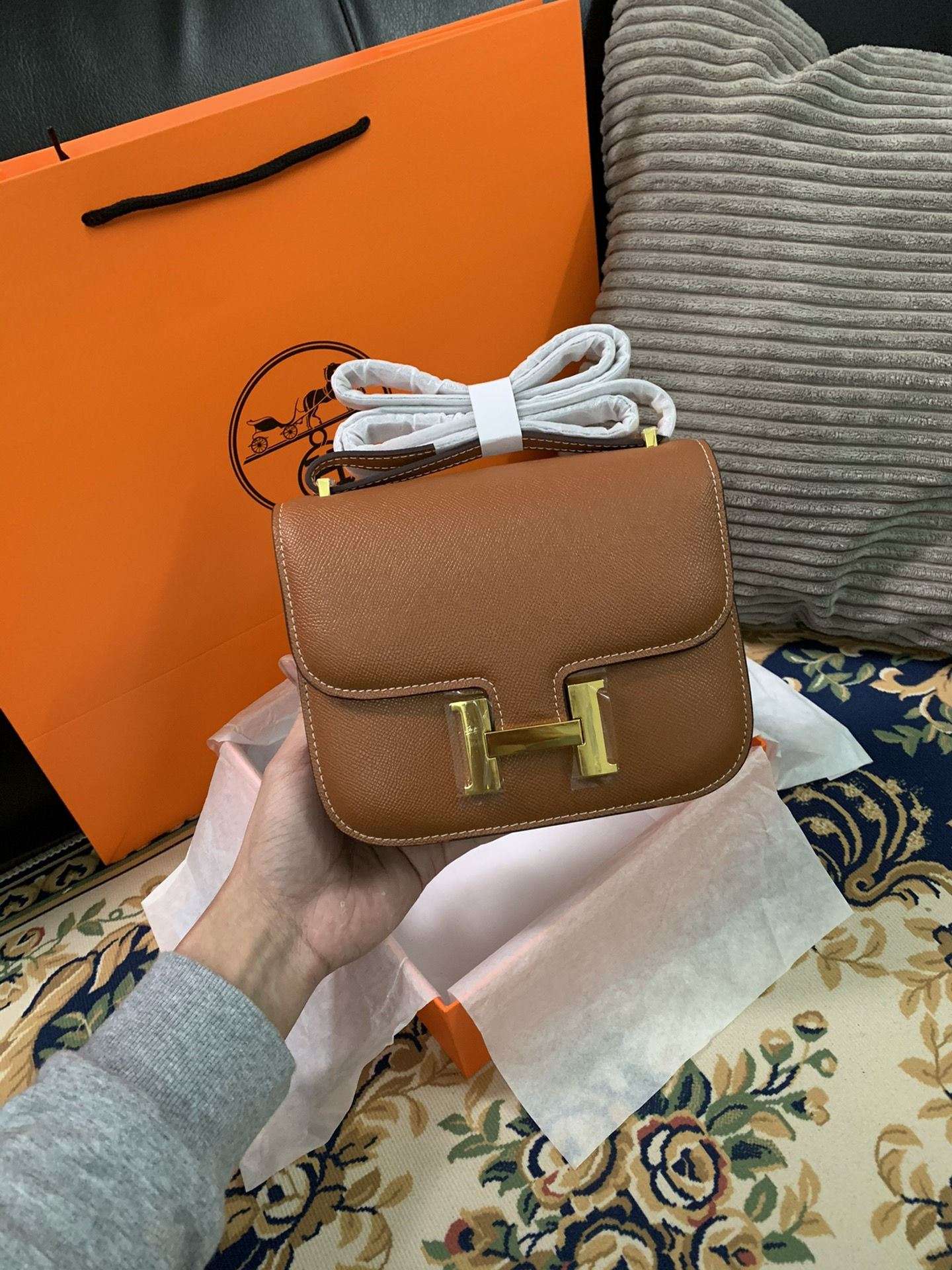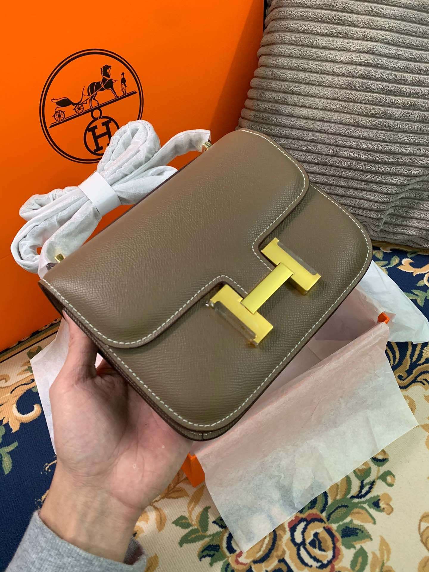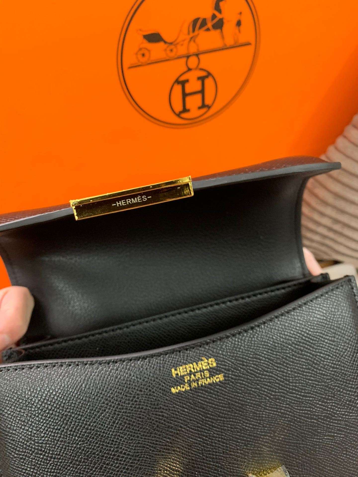 • Efficiency meets style in every Hermes bag, when sophistication is a must have, timeless attribute, as seen in this Constance shoulder bag. Featuring a smooth surface with a matte finish, gold-tone hardware, a foldover top with push-lock closure, interior compartments divided by a partition, an internal zipped pocket and a front centre logo stamp.