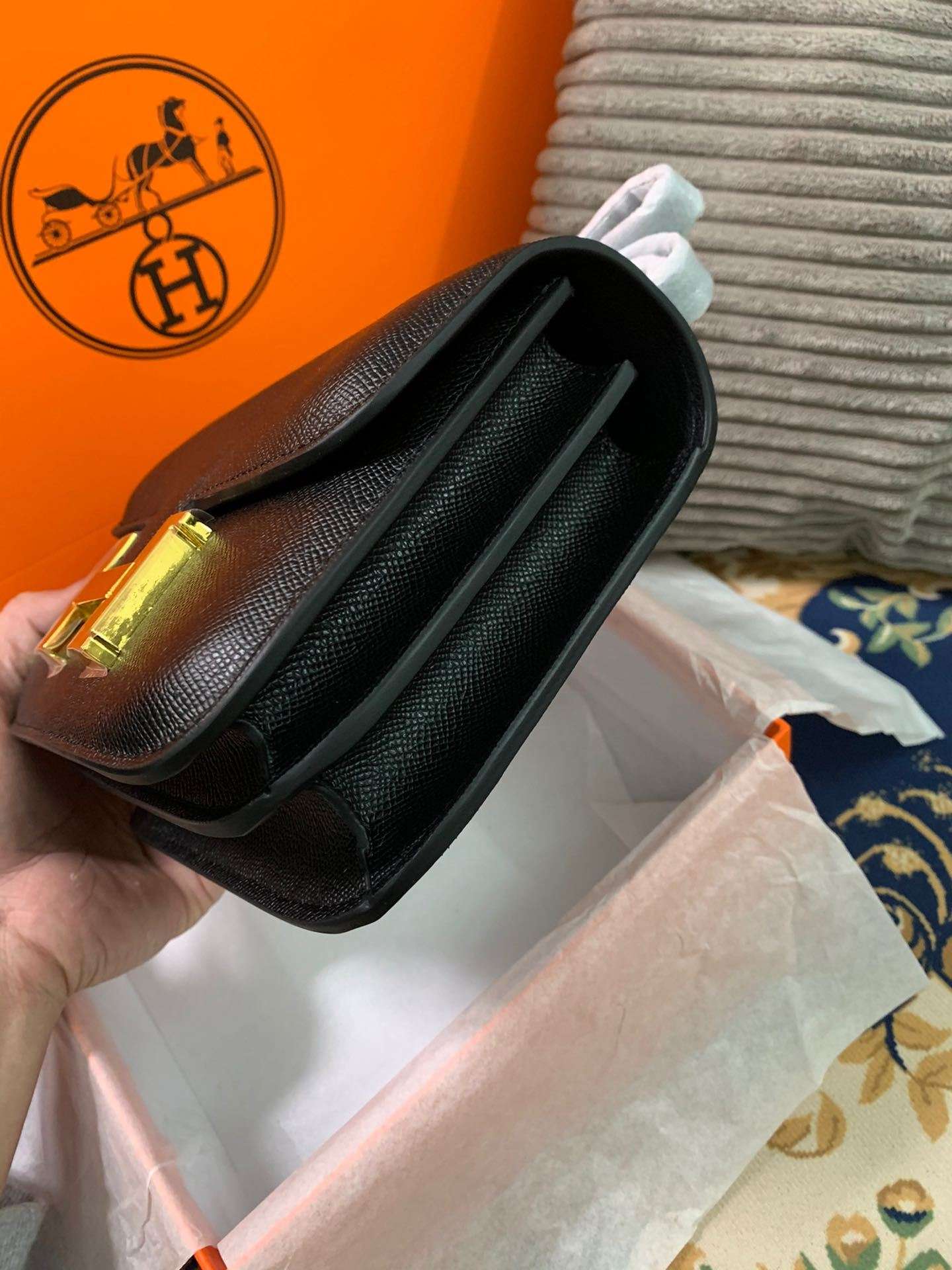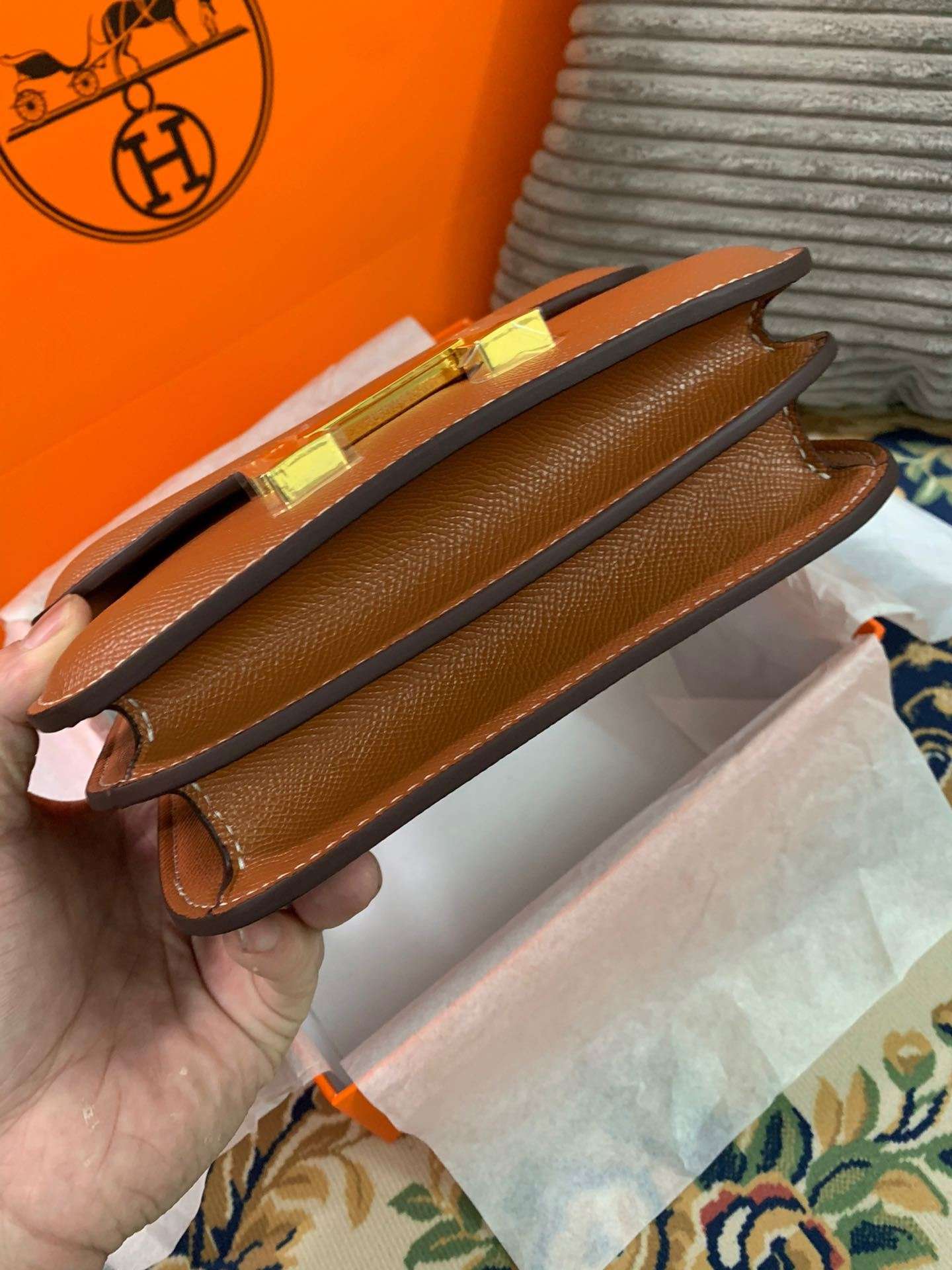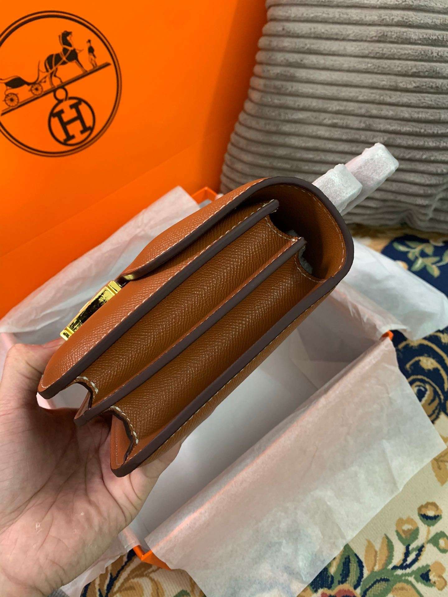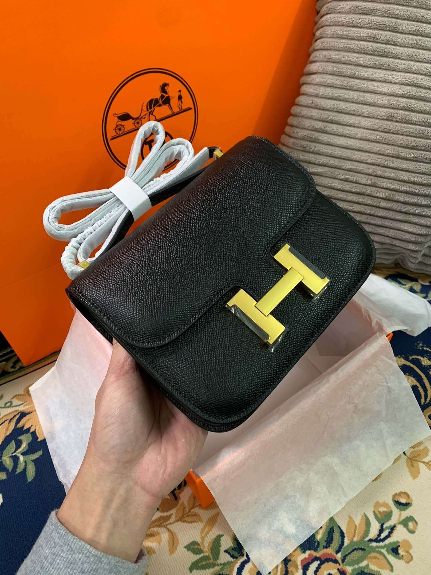 • Efficiency meets style in every Hermes bag, when sophistication is a must have, timeless attribute, as seen in this Constance shoulder bag. Featuring a smooth surface with a matte finish, gold-tone hardware, a foldover top with push-lock closure, interior compartments divided by a partition, an internal zipped pocket and a front centre logo stamp.