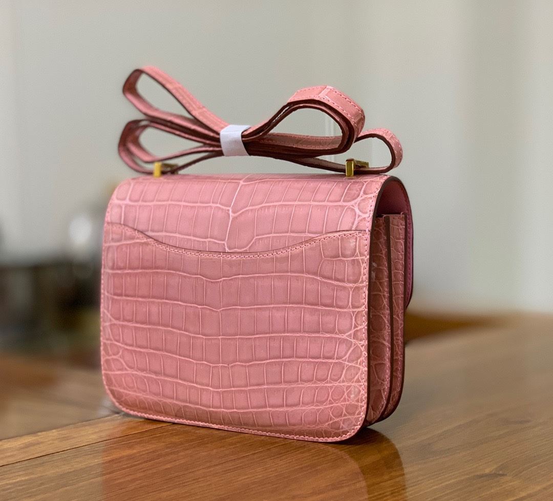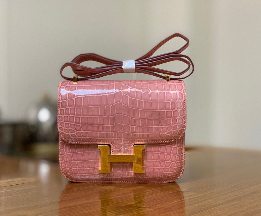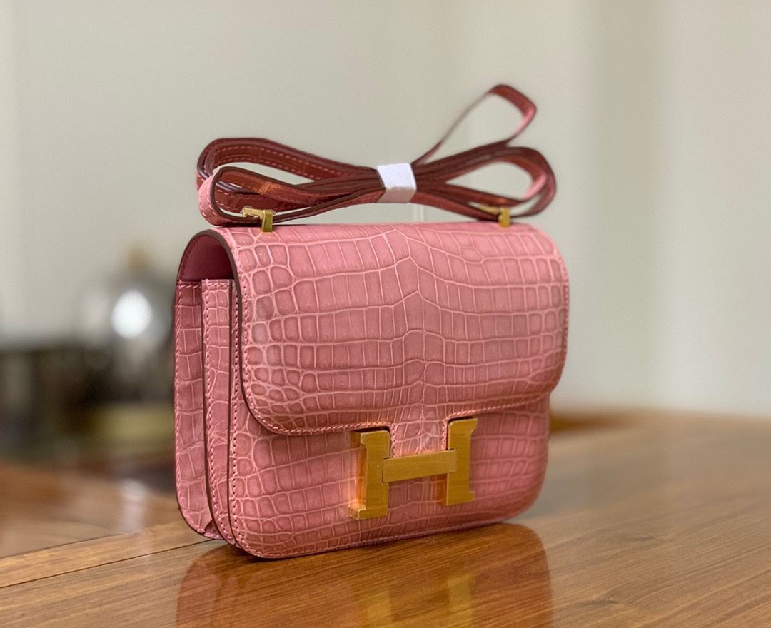 - Efficiency meets style in every Hermes bag, when sophistication is a must have, timeless attribute, as seen in this Constance shoulder bag. Featuring a smooth surface with a matte finish, gold-tone hardware, a foldover top with push-lock closure, interior compartments divided by a partition, an internal zipped pocket and a front centre logo stamp.