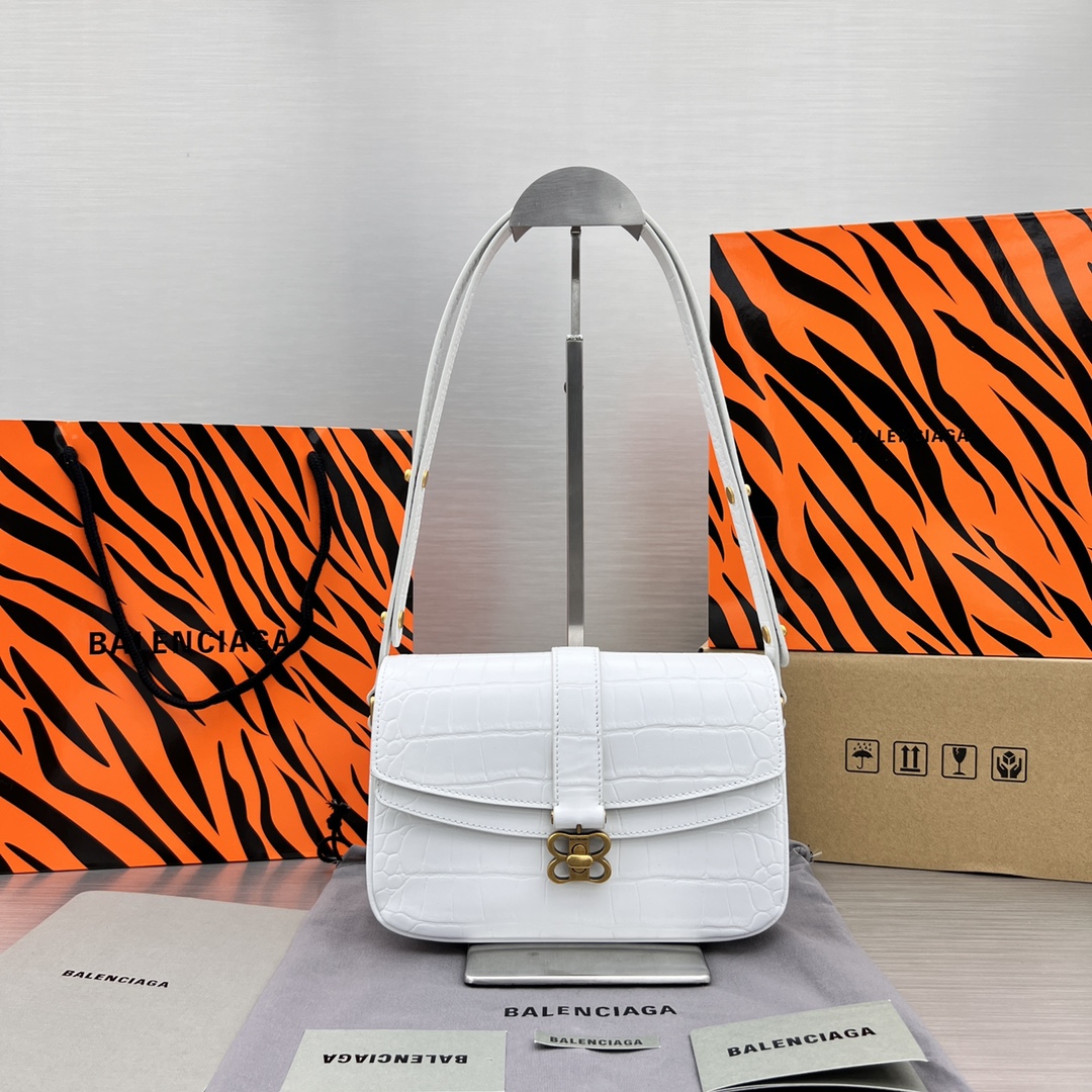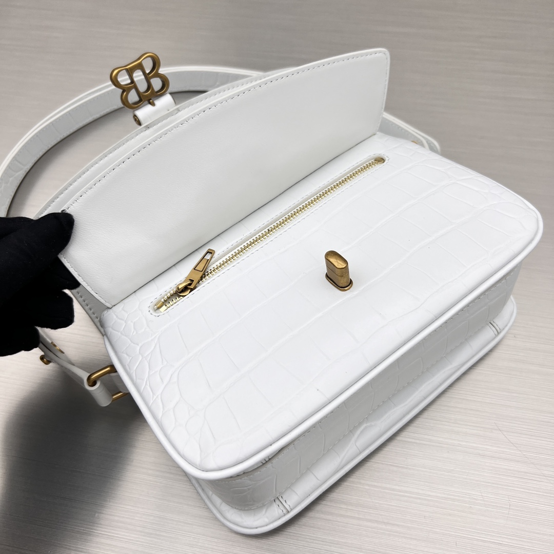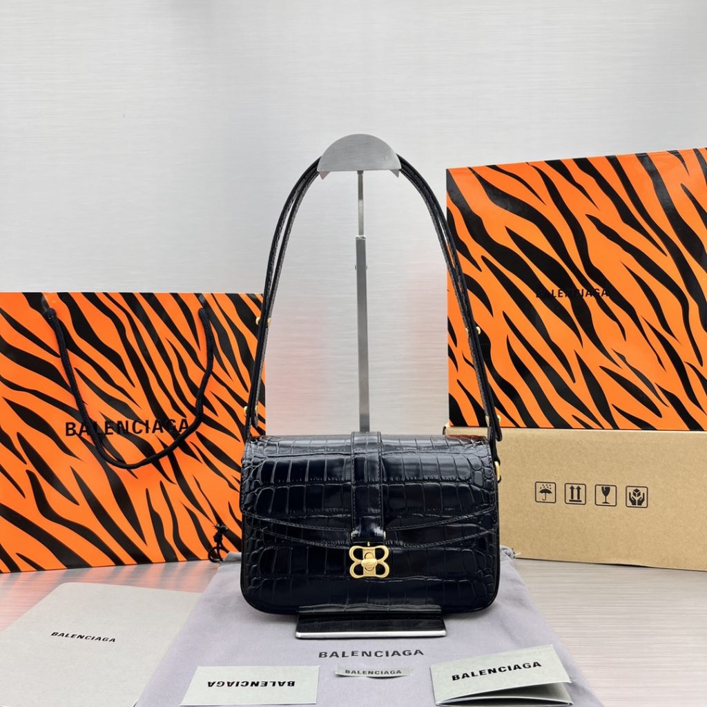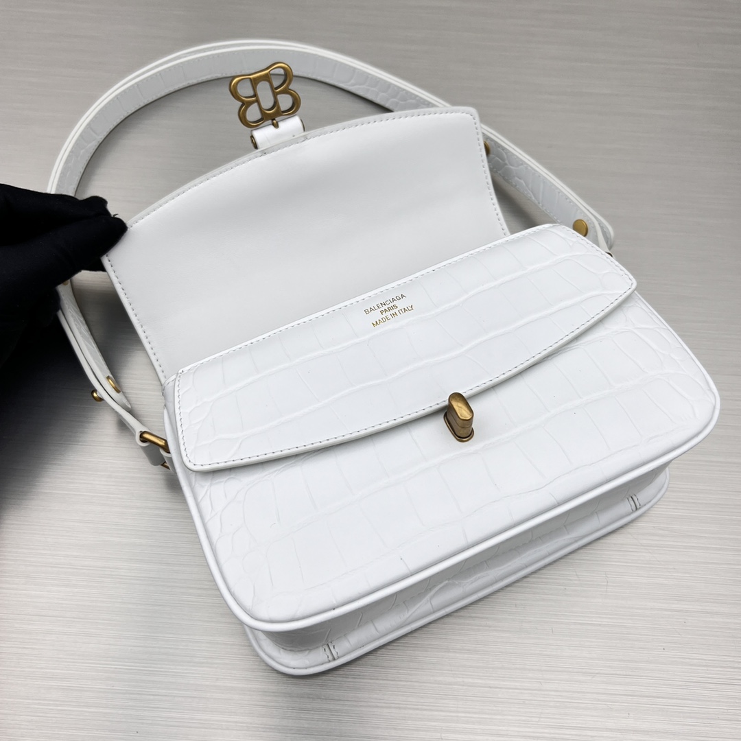 • ‘Lady Flap Small’ shoulder bag from Balenciaga. Crafted from with a effect, this design secures with a metal BB Butterfly twist closure and features an adjustable strap, a back slip pocket, antiqued gold-tone metal hardware and an interior with one flapped zip pocket and three separate compartments with one zip pocket and one slip pocket.