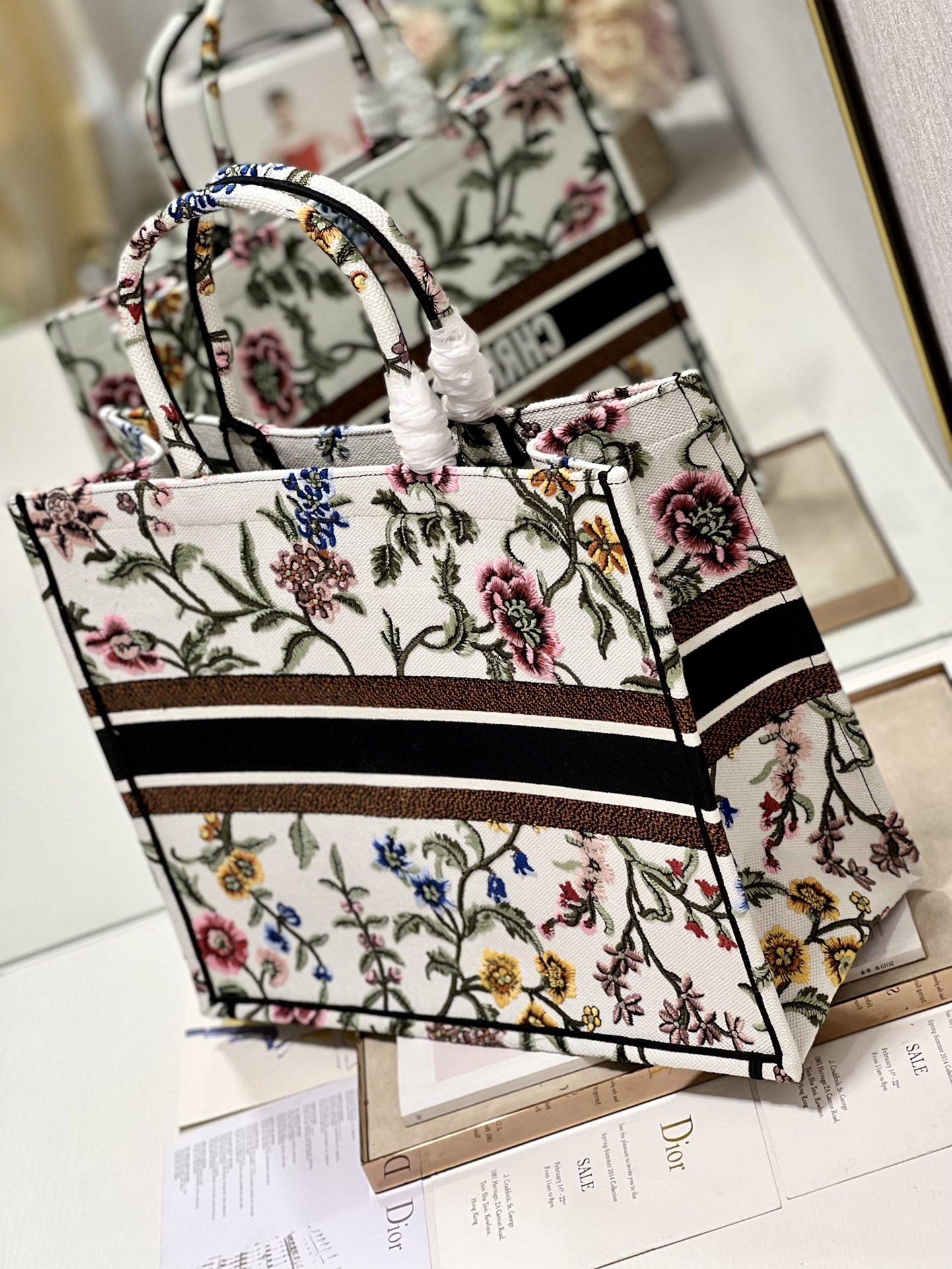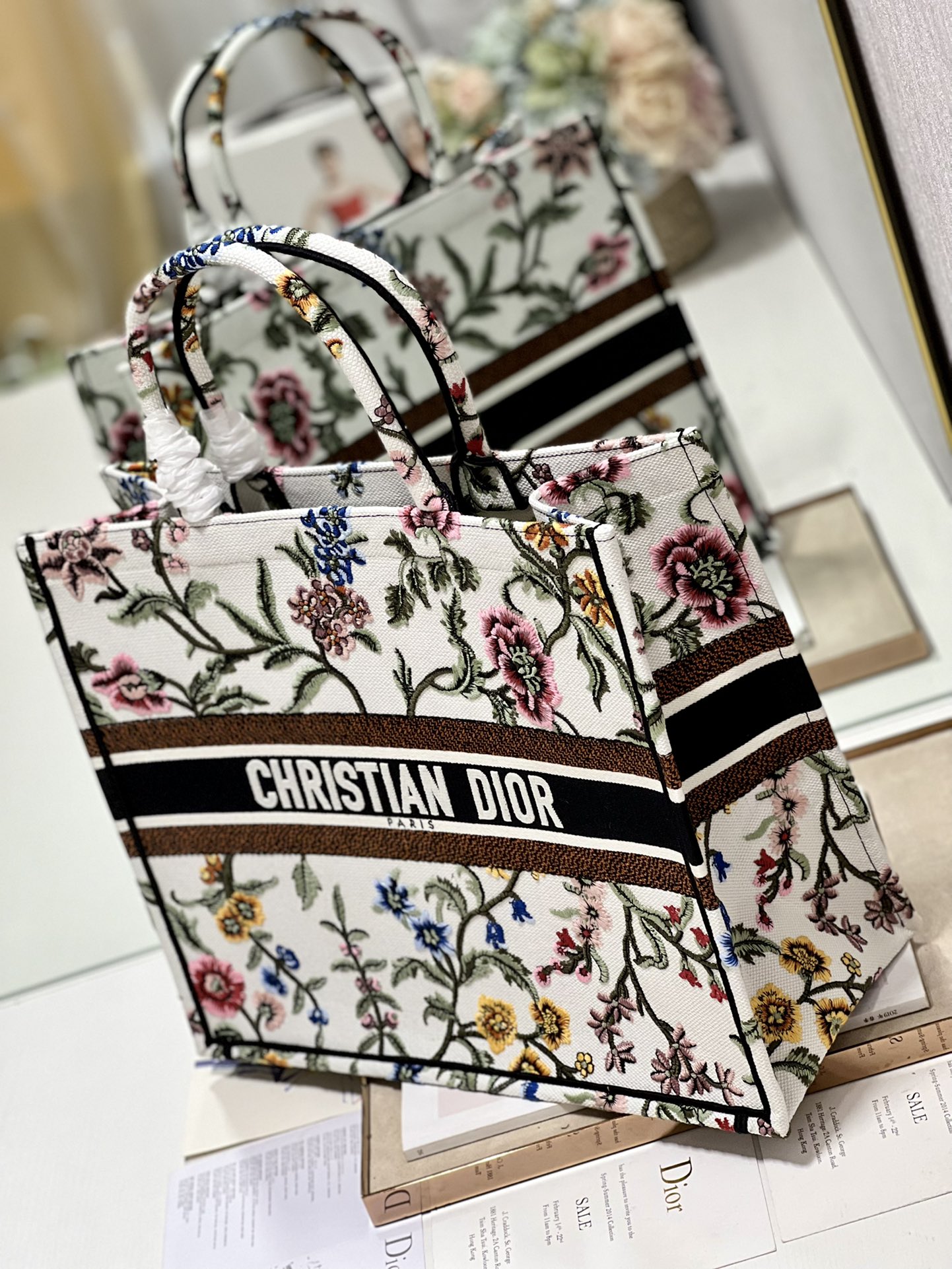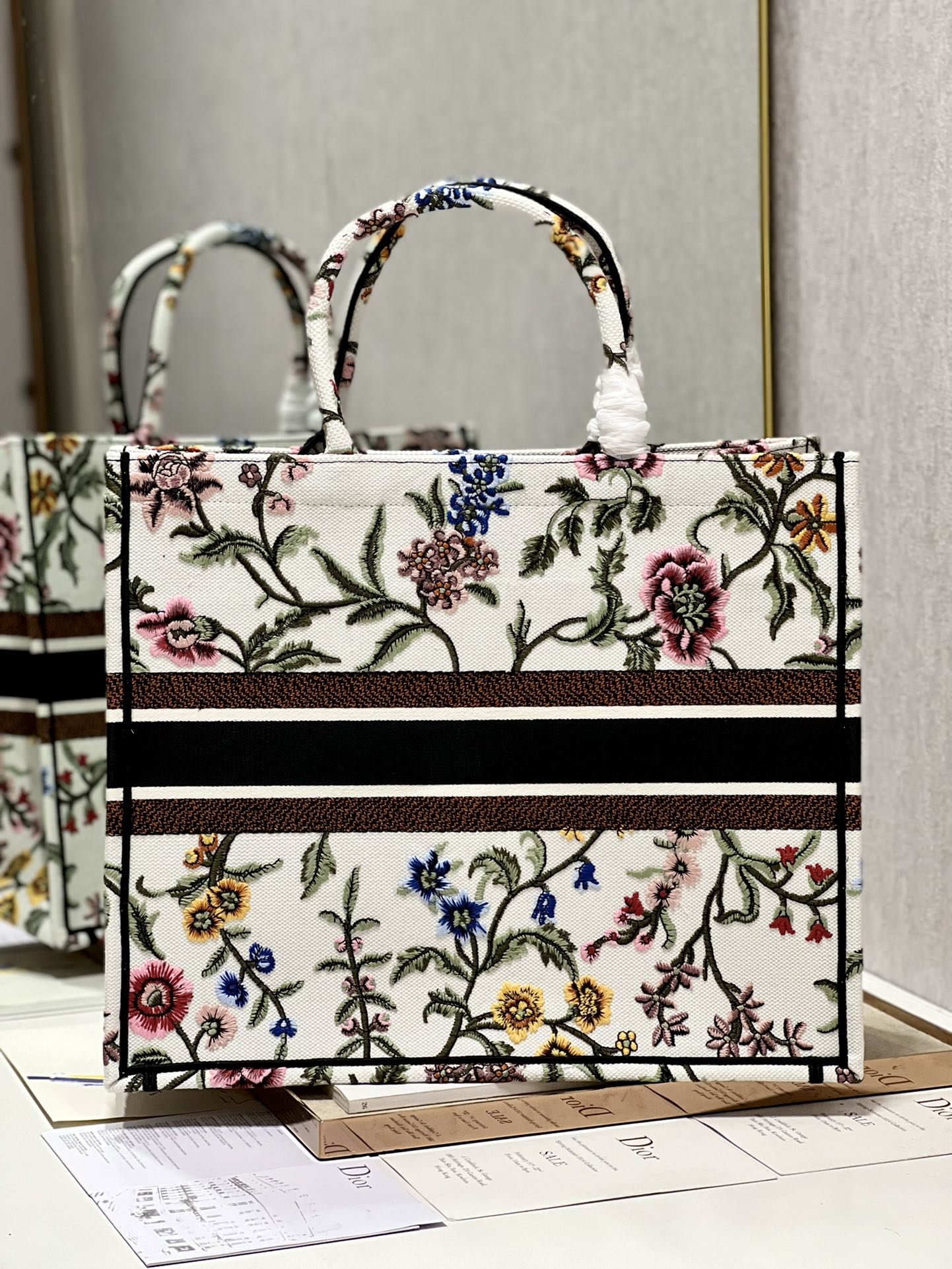 Introduced by Maria Grazia Chiuri, Creative Director of Christian Dior, the Large Dior Book Tote Bag has become a staple of the Dior aesthetic. Designed to hold all daily essentials, the style is fully embroidered with a multicolor Dior Petites Fleurs motif, a romantic and vibrant homage to Mr. Dior’s passion for florals. Adorned with the Christian Dior Paris signature on the front, the small tote exemplifies the House’s signature savoir-faire and may be carried by hand.