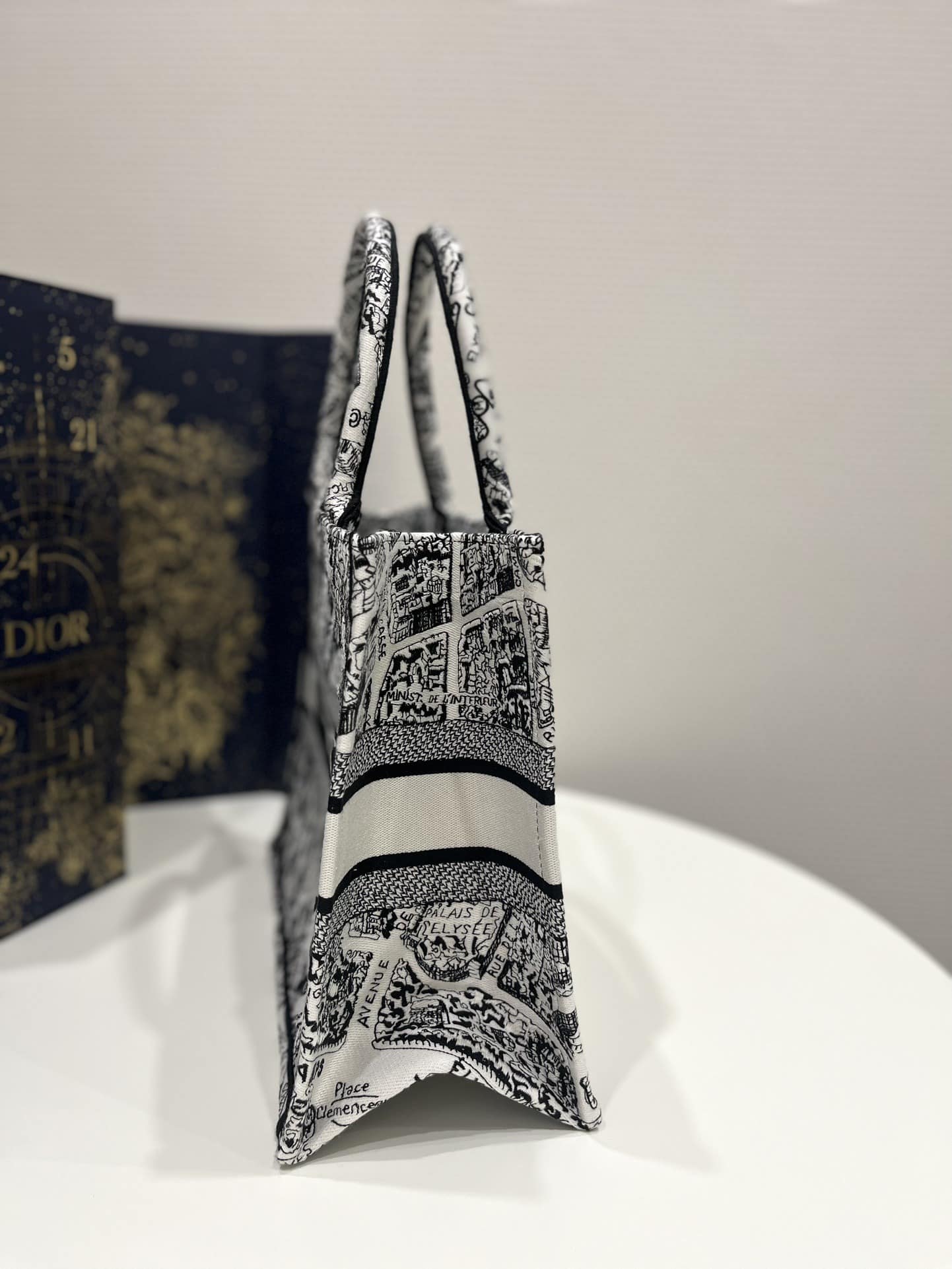Introduced by Maria Grazia Chiuri, Creative Director of Christian Dior, the Medium Dior Book Tote has become a staple of the Dior aesthetic. Designed to hold all the daily essentials, the style is fully embroidered with the season’s signature white and black Plan de Paris motif, inspired by the House archives and centered around Dior’s historic address on Avenue Montaigne. Adorned with the Christian Dior Paris signature on the front, the medium tote exemplifies the House’s signature savoir-faire and may be carried by hand or worn over the shoulder.