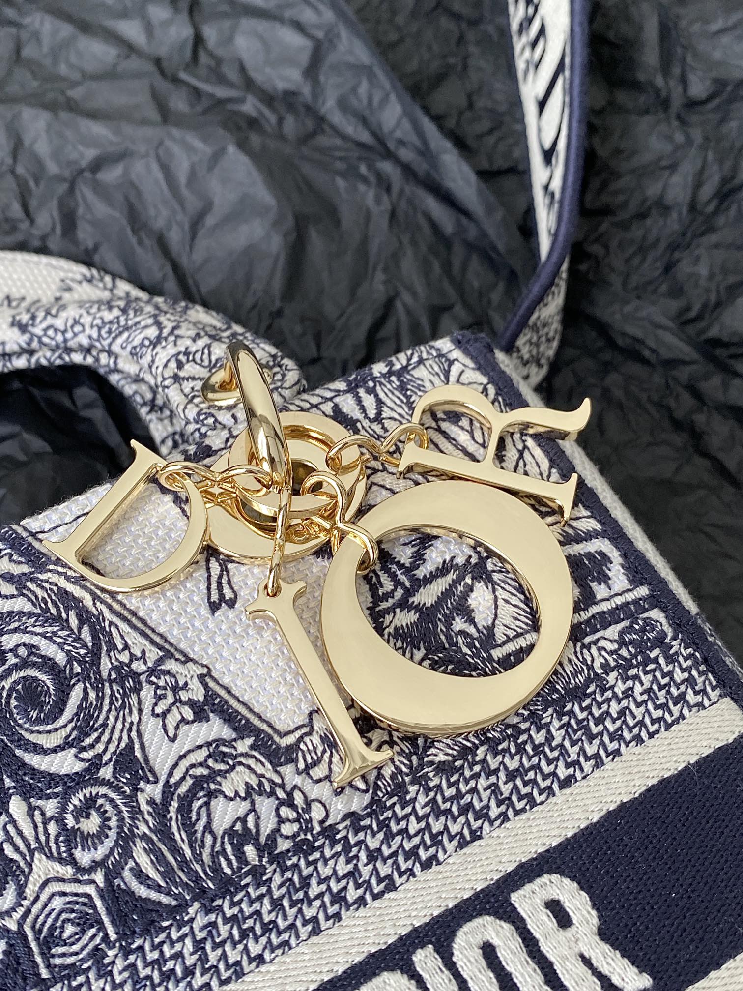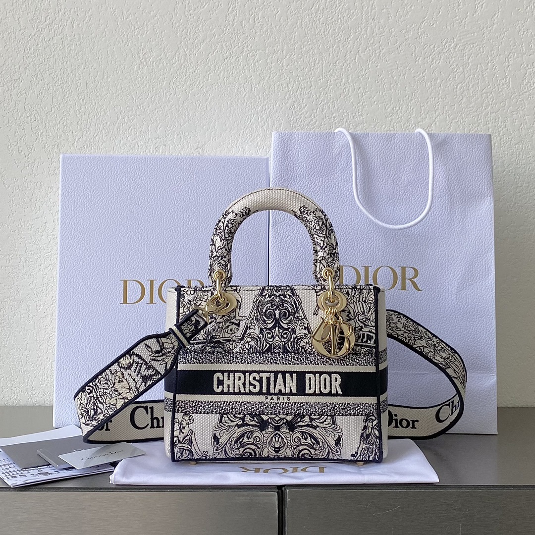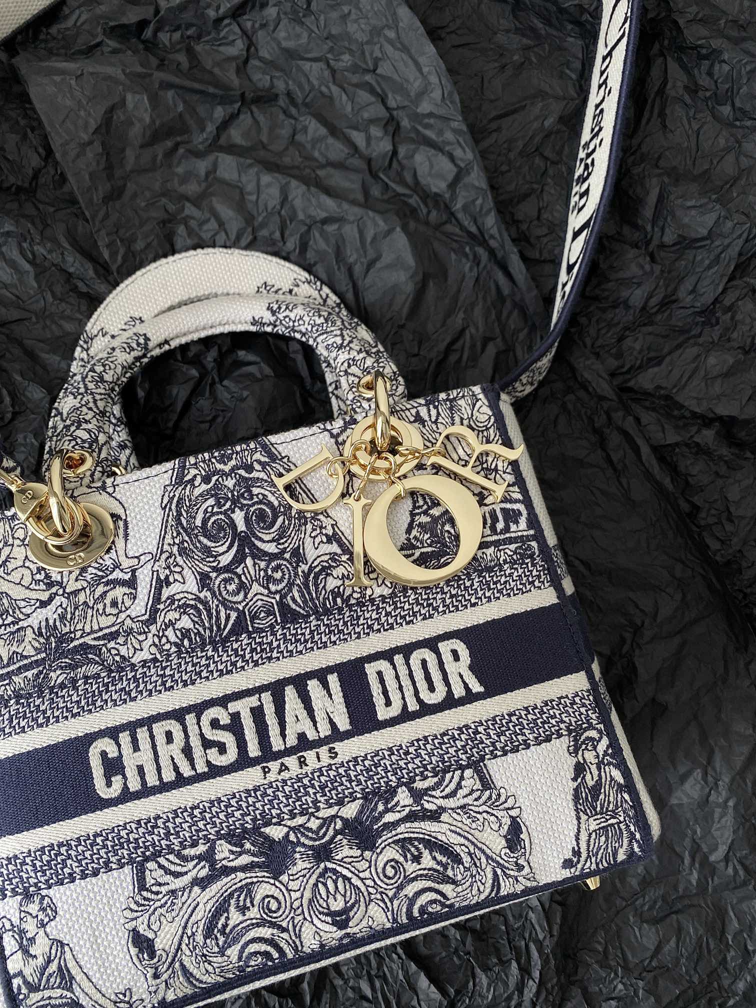 The Lady D-Lite bag combines classic elegance with House modernity. The style is fully embroidered with the season’s signature black and white Plan de Paris motif, inspired by House archives and centered around Dior’s historic address on Avenue Montaigne. The front features a Christian Dior Paris signature while the D.I.O.R. charms in pale gold-finish metal embellish and illuminate the silhouette. Equipped with a wide, reversible and removable embroidered shoulder strap, the medium Lady D-Lite bag can be carried by hand or worn crossbody.