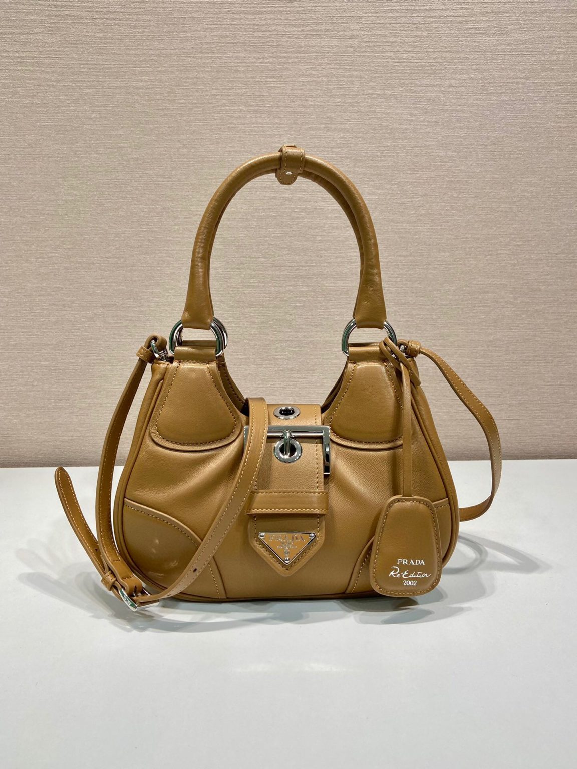 Reimagining the iconic lines of a model from the Prada archives from the 2000s, this nappa bag combines traditional elements reinterpreting them in a new way, with an innovative soft design. Softness and simplicity of the silhouette define this hobo bag, embellished by the ton-sur-ton triangle logo that frames the lettering logo, creating a three-dimensional and material game and enriching the design of the accessory.