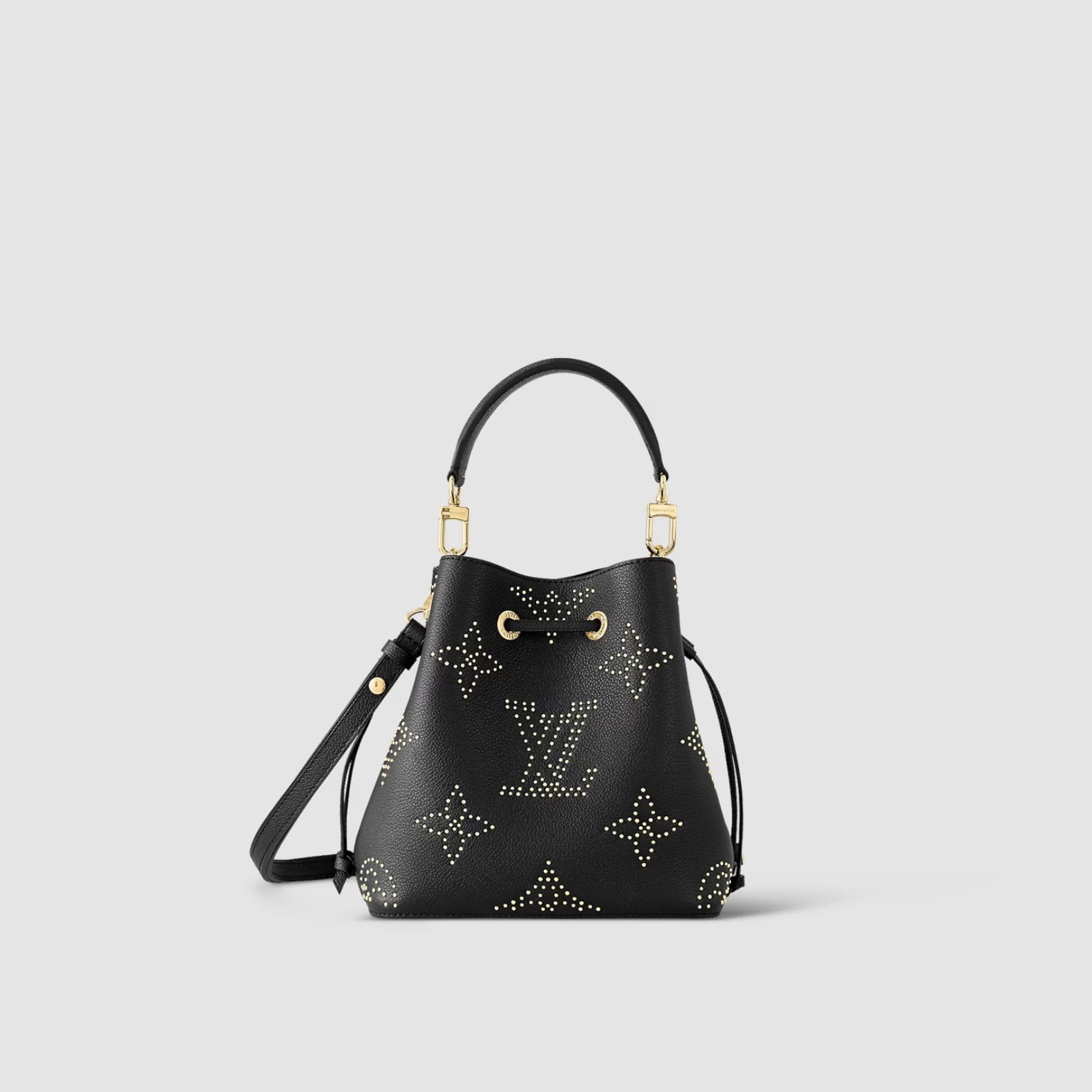 The NéoNoé BB bucket bag features an edgy version of the Monogram pattern formed with studs, each coated with 0.25 microns of gold. This compact bag is just the right size for belongings like a phone, keys, and a wallet. There’s a detachable top handle for hand and elbow carry as well as a removable shoulder strap.