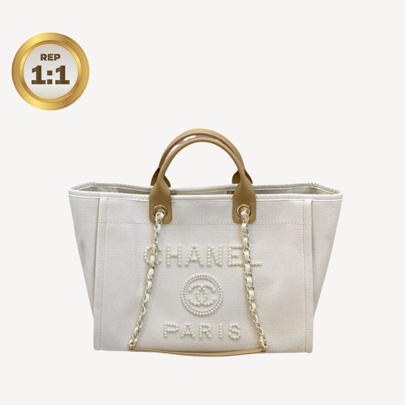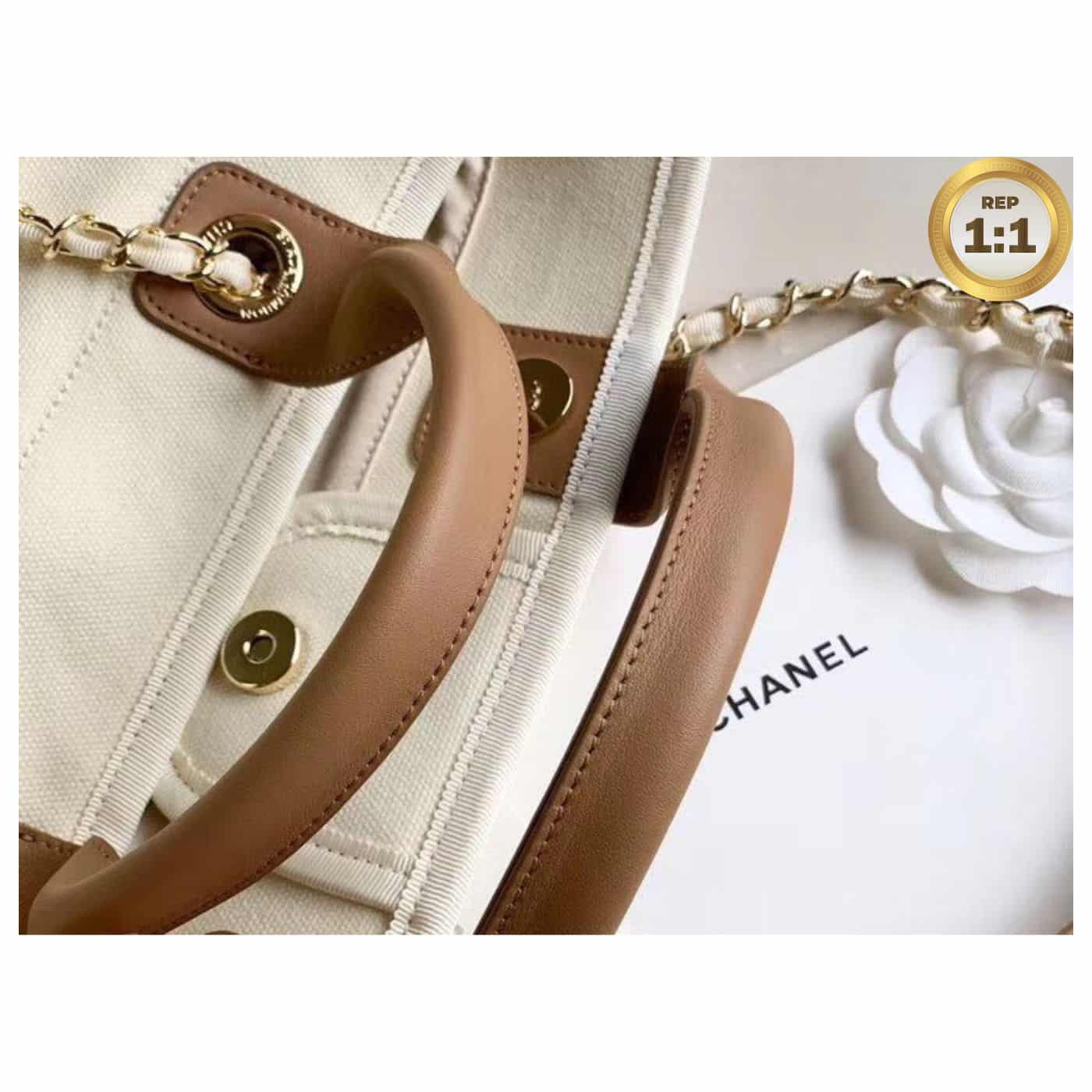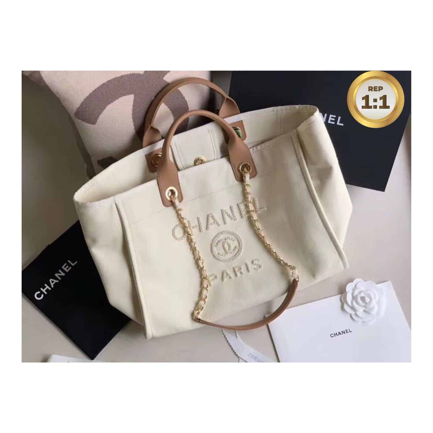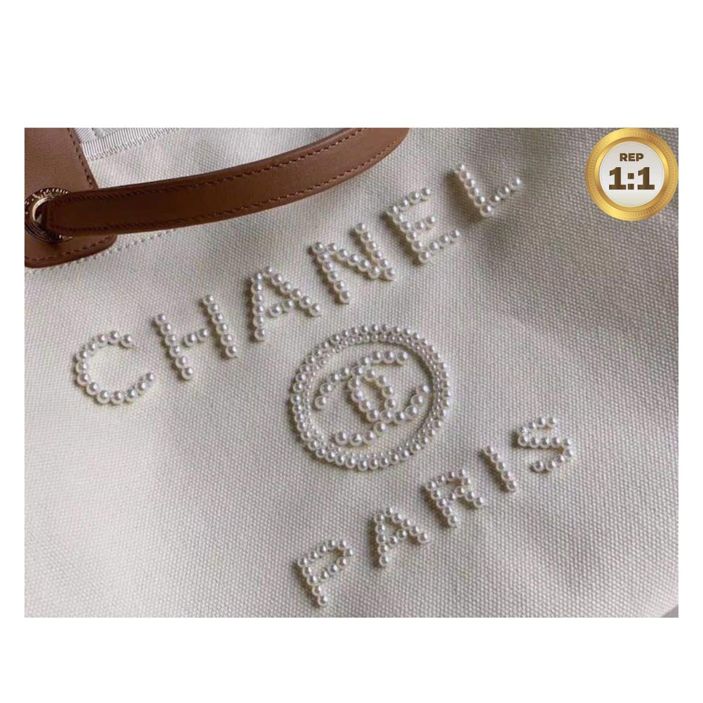 • In 2020 Chanel released a limited edition version of the Deauville tote bag which features the logo in imitation pearls on the front. The pearl logo version of the bag is available in two colors, black, Ecru beige and has since become an influencer must-have. The Deauville tote isn’t vastly different in size to the small, but it does feature the added bonus of leather handles for carrying the bag in hand or comfortably in the crook of the elbow. The longer shoulder chain straps are still an option too, so this can be worn in that way too.