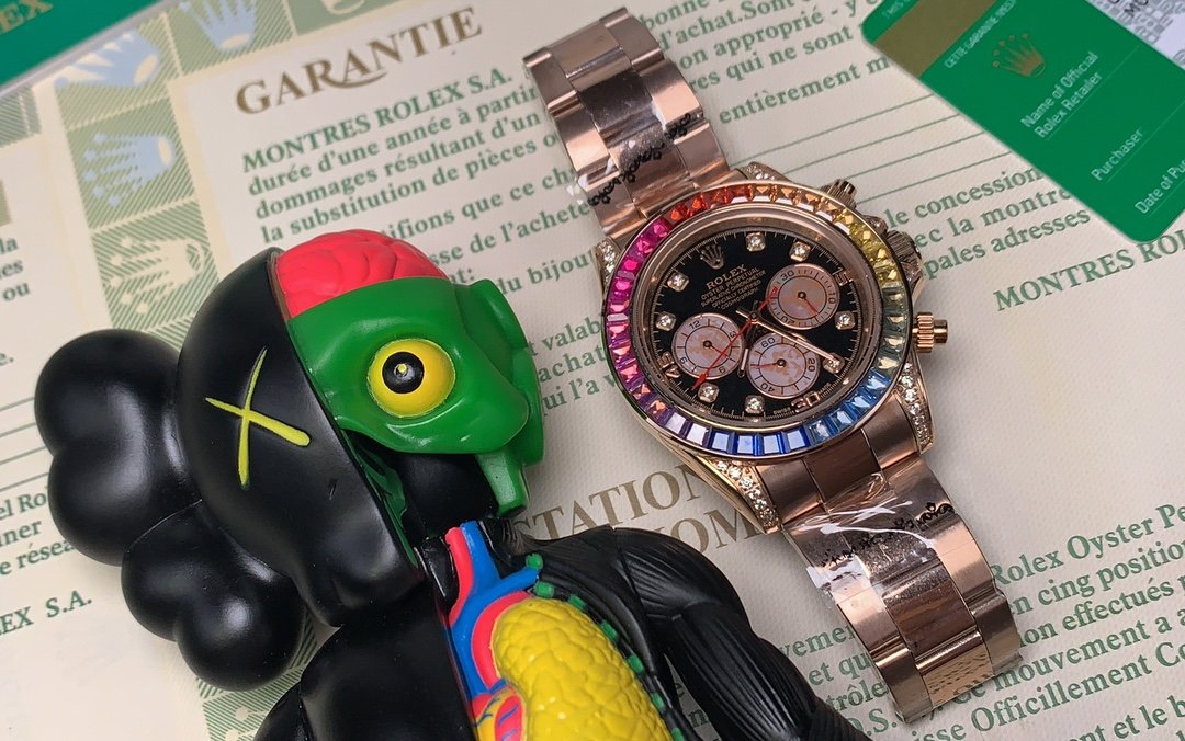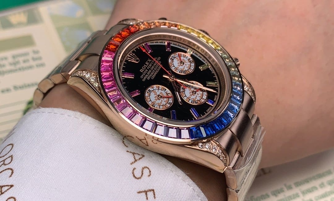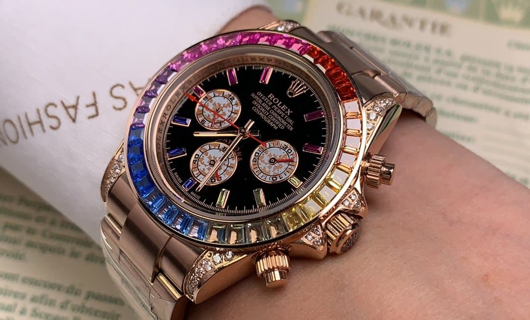 Rolex Daytona Cosmograph Rainbow Crystals Bezel Gold Toned Strap Black Dial 80251