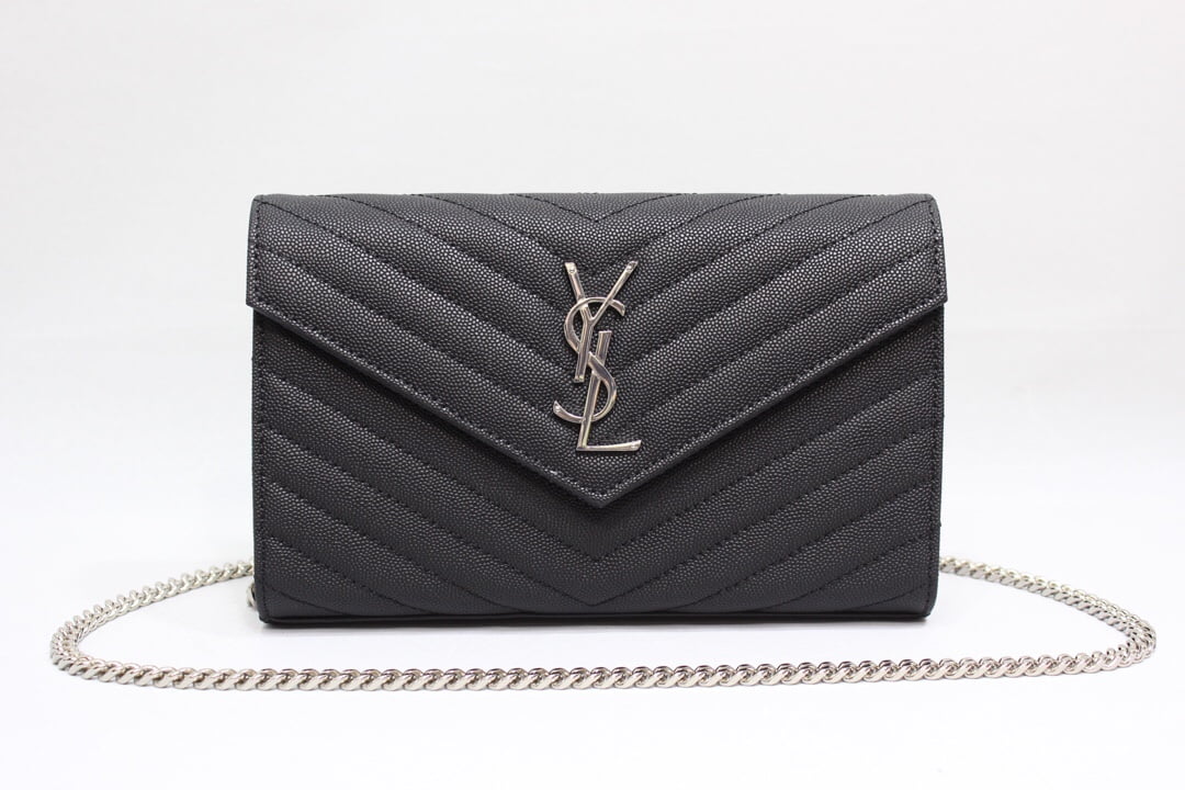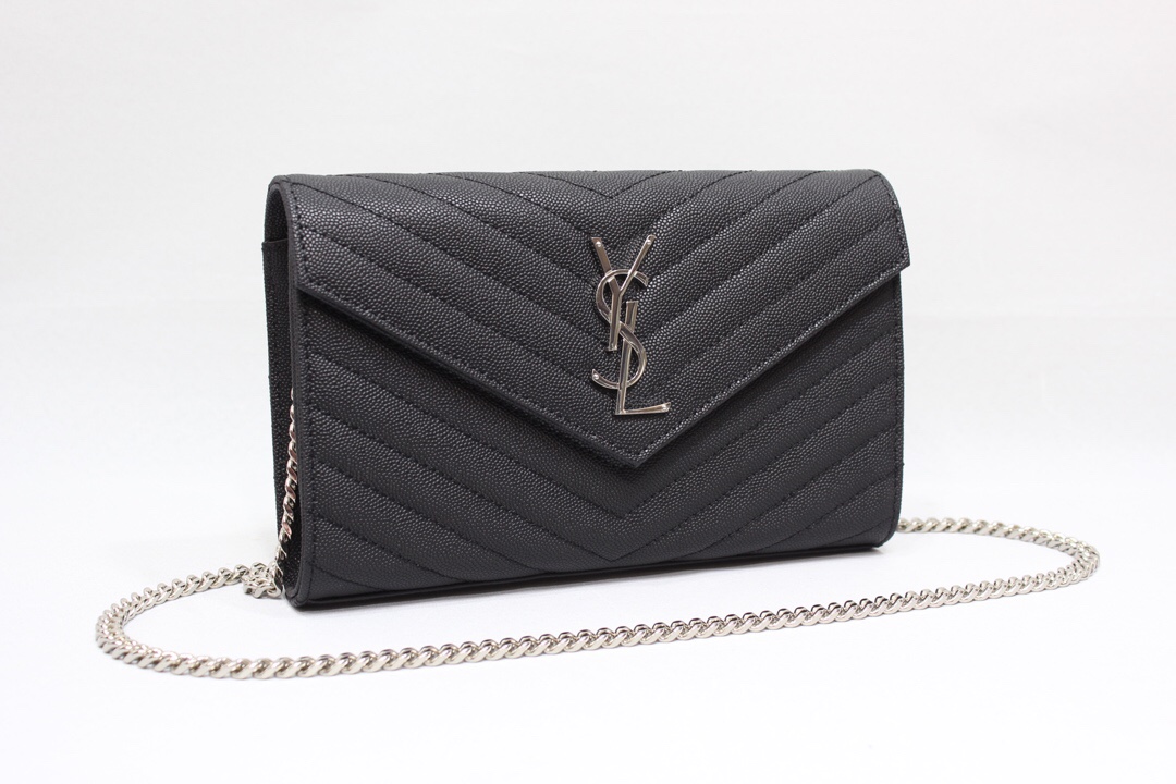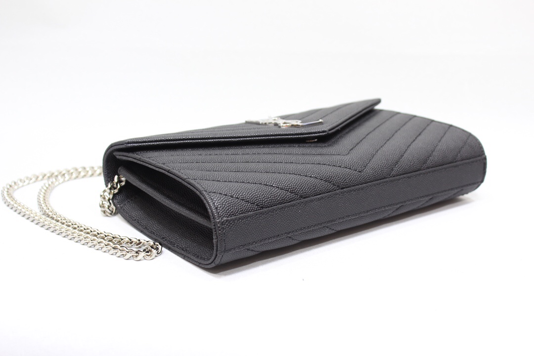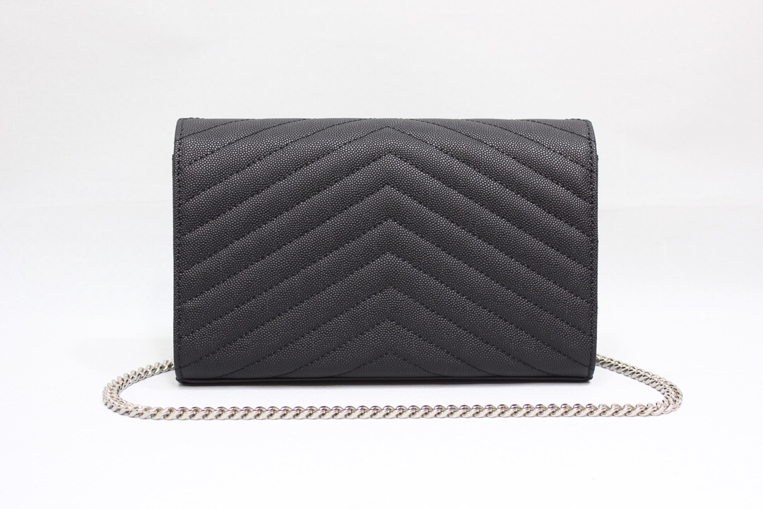 Saint Laurent Cassandre Matelassé Chain Wallet In Grain De Poudre Embossed Black For Women 8.8in/23cm YSL 377828BOW021000