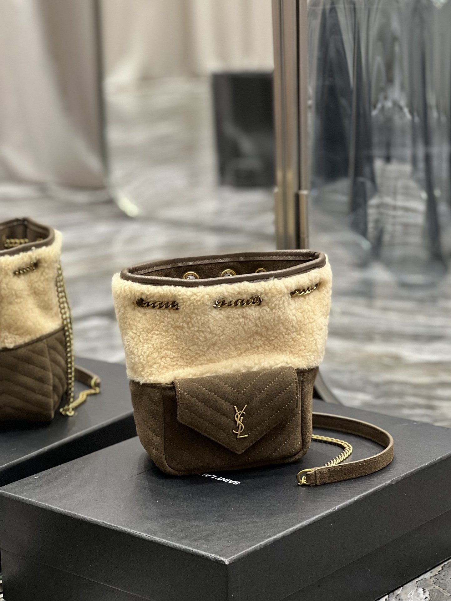 Mini bucket bag decorated with quilted chevron stitching and iconic ysl signature.