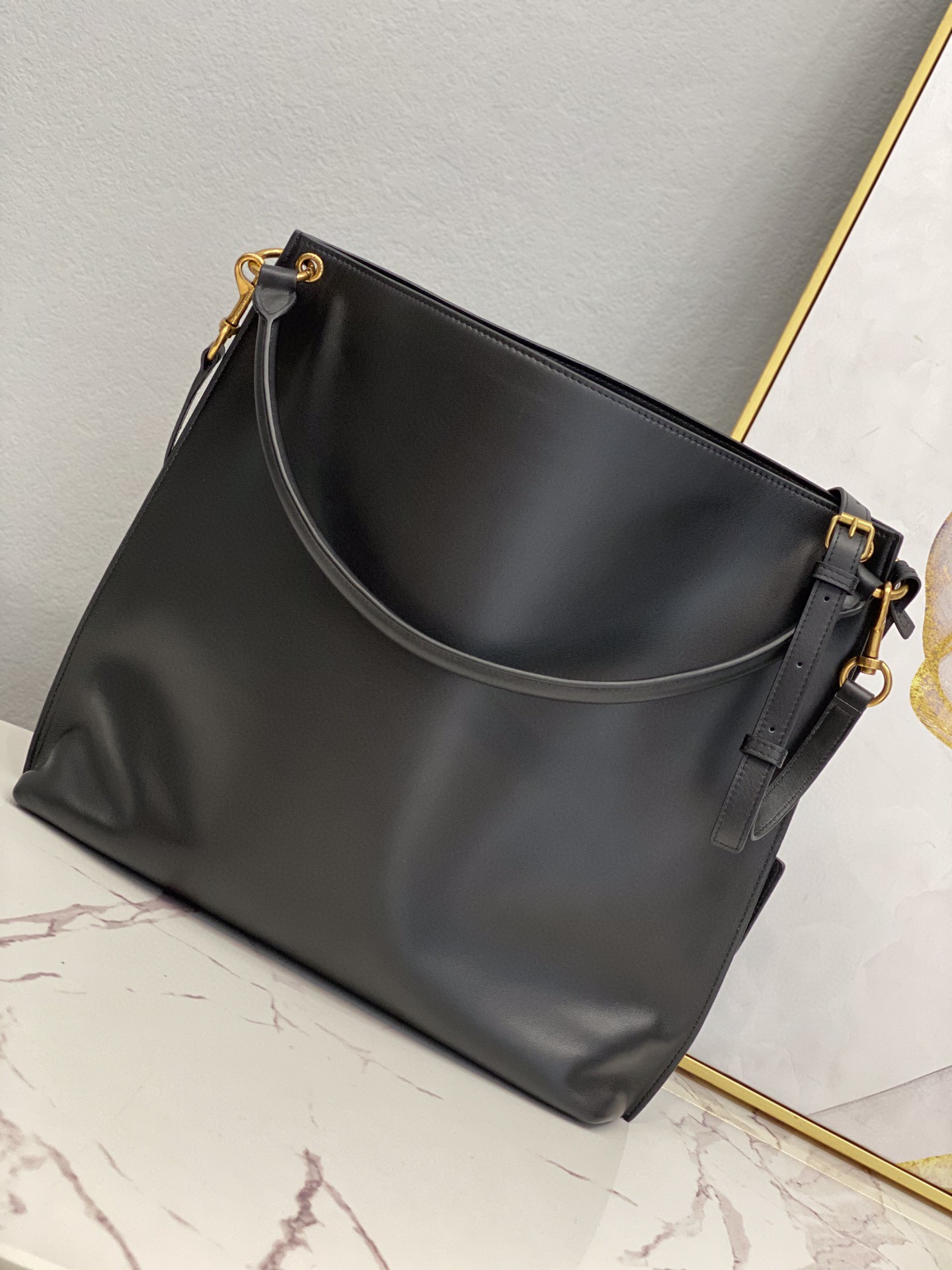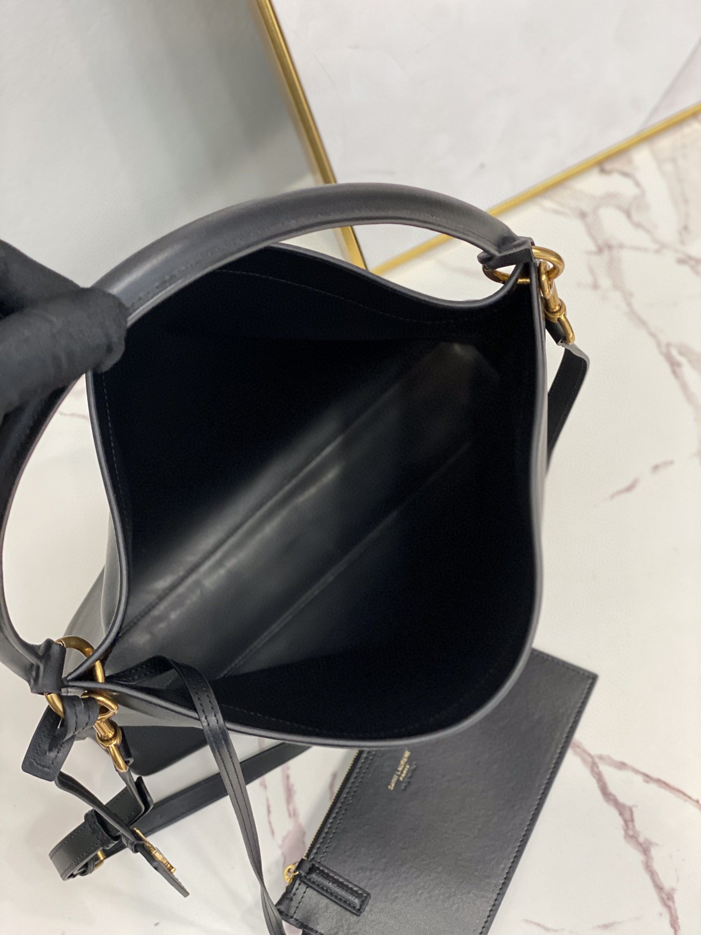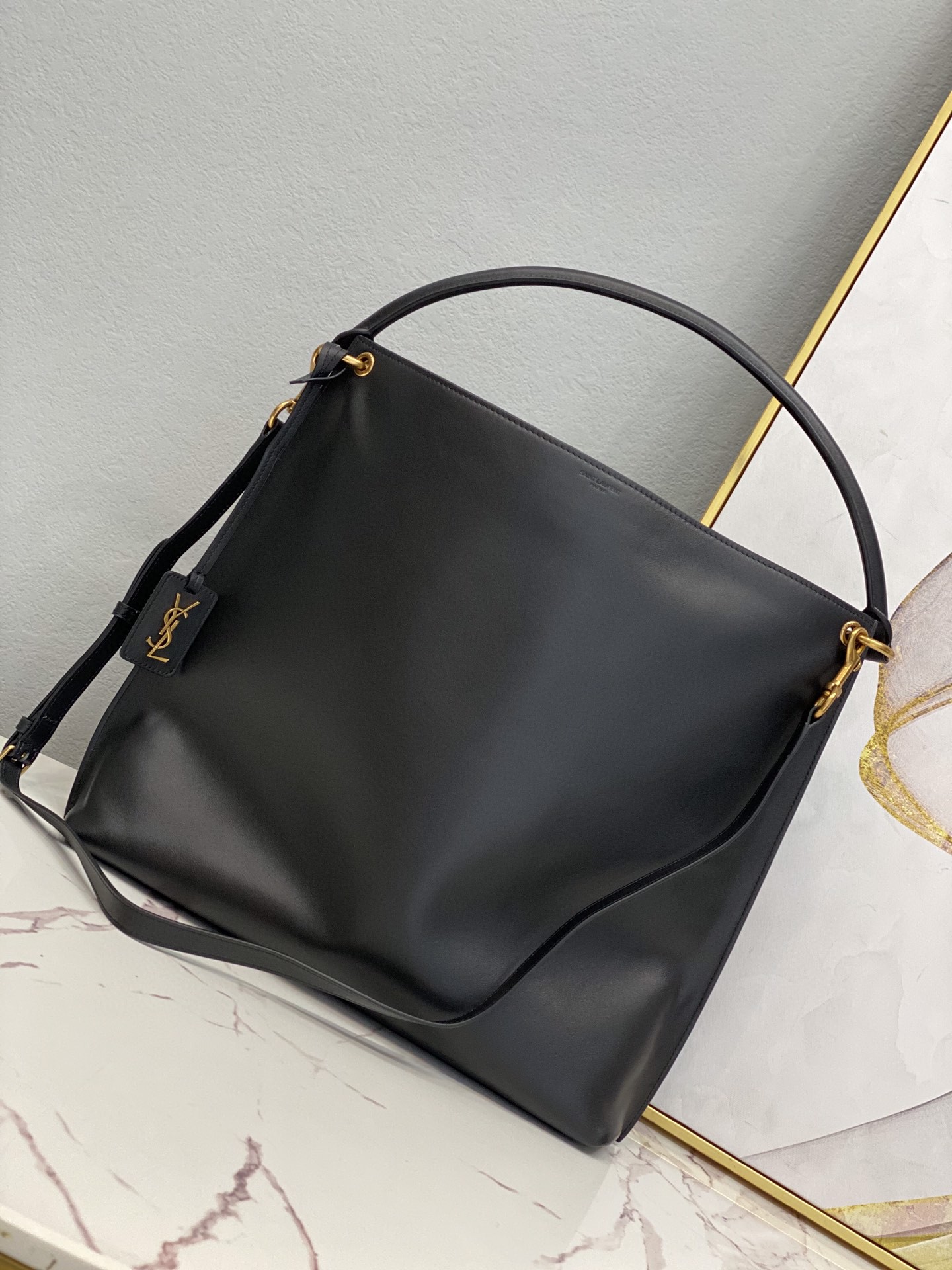Saint Laurent unstructured tote bag with flat handles and removable encased metal interlocking ysl signature charm.