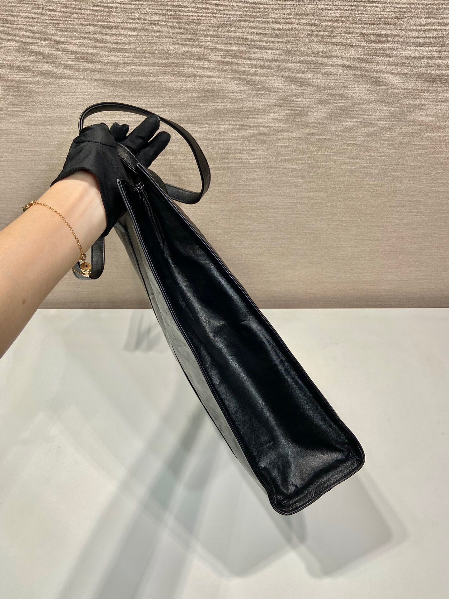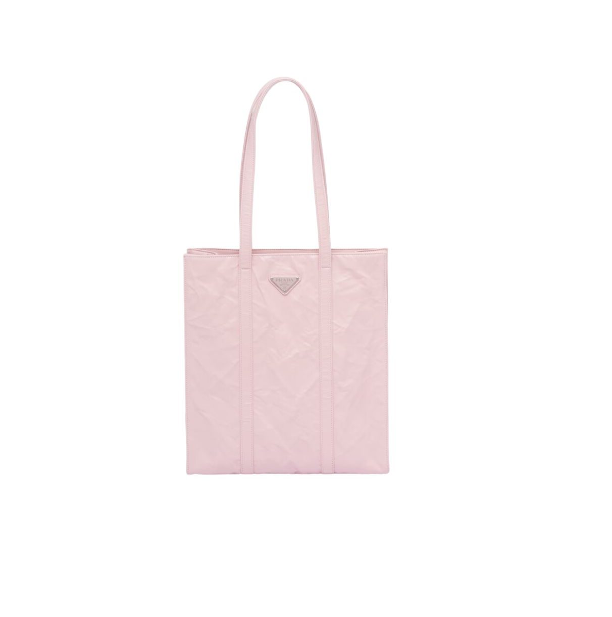 This bag with casual yet classic allure is made of nappa with a glossy effect and natural finish. The hand-made wrinkled effect contrasts with the structured and rigid design concept, reinterpreting an everyday object to be worn without constraints.Presented for the Spring Summer 2023 collection, the accessory is decorated with the enameled metal triangle logo.